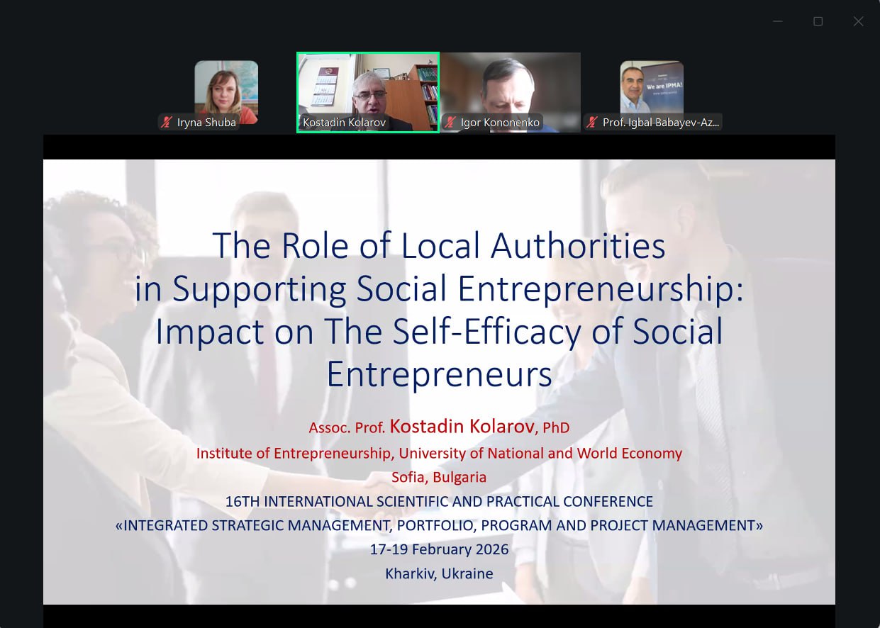 Доктор Костадін КОЛАРОВ, директор Інституту підприємництва Університету національної і світової економіки (Болгарія) присвятив доповідь ролі місцевих органів влади у підтримці соціального підприємництва. Особлива увага в дослідженні приділяється ролі місцевої влади як чинника, що визначає рівень самоефективності (self-efficacy) соціального підприємця. Важливою особливістю самоефективності соціального підприємця, порівняно з традиційним, є переконання у здатності досягти позитивних соціальних змін, а наявність високої самоефективності призведе до створення більшої соціальної цінності.