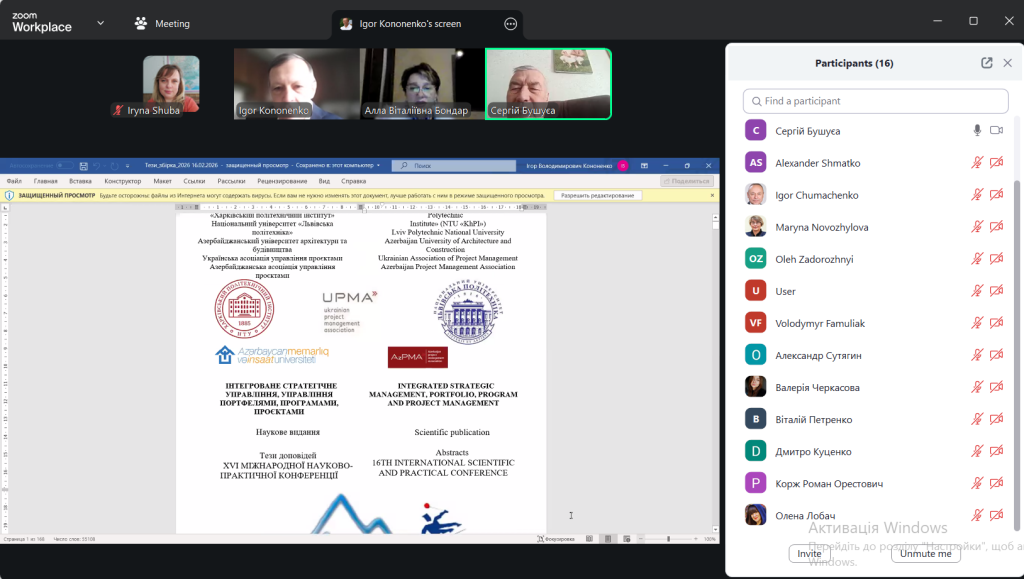 17-19 лютого 2026 року відбулась XVI Міжнародна науково-практична конференція «Інтегроване стратегічне управління, управління портфелями, програмами, проєктами», яка в умовах війни була проведена онлайн.