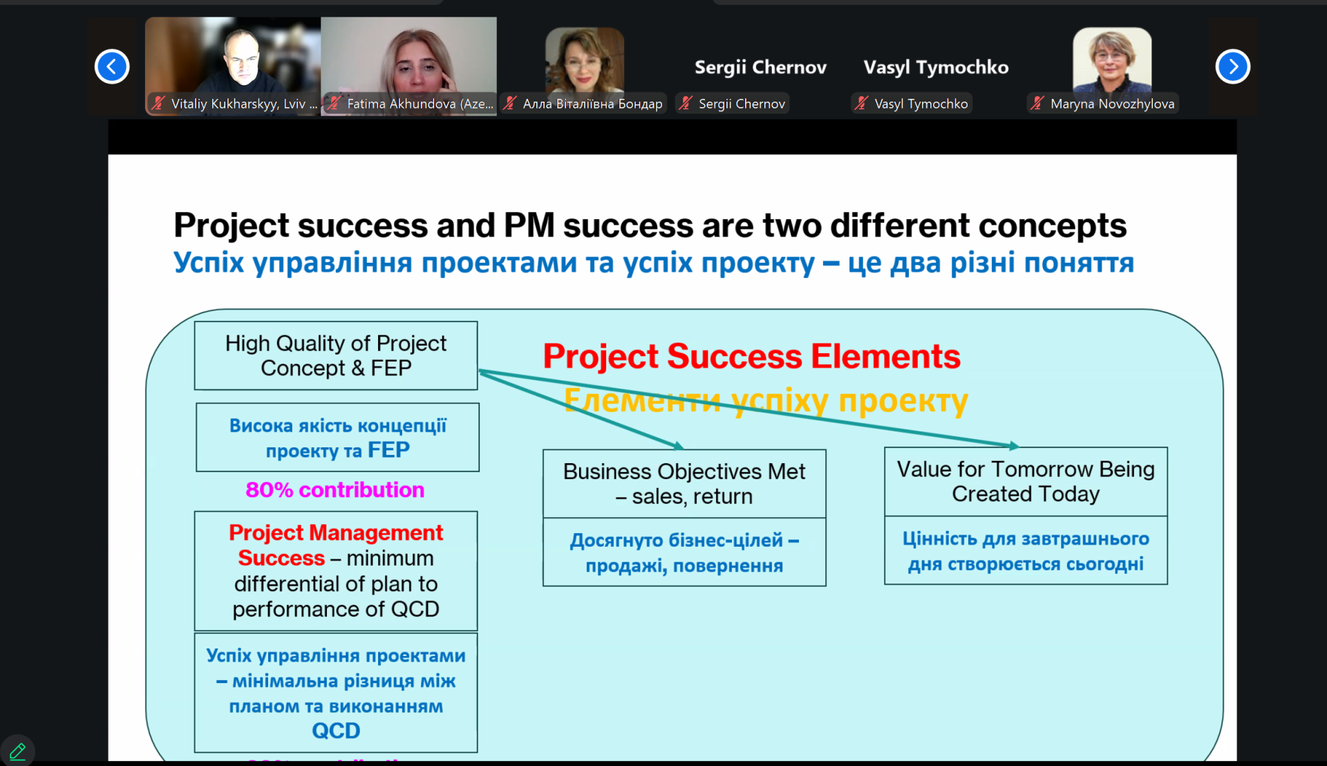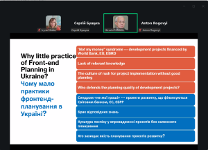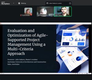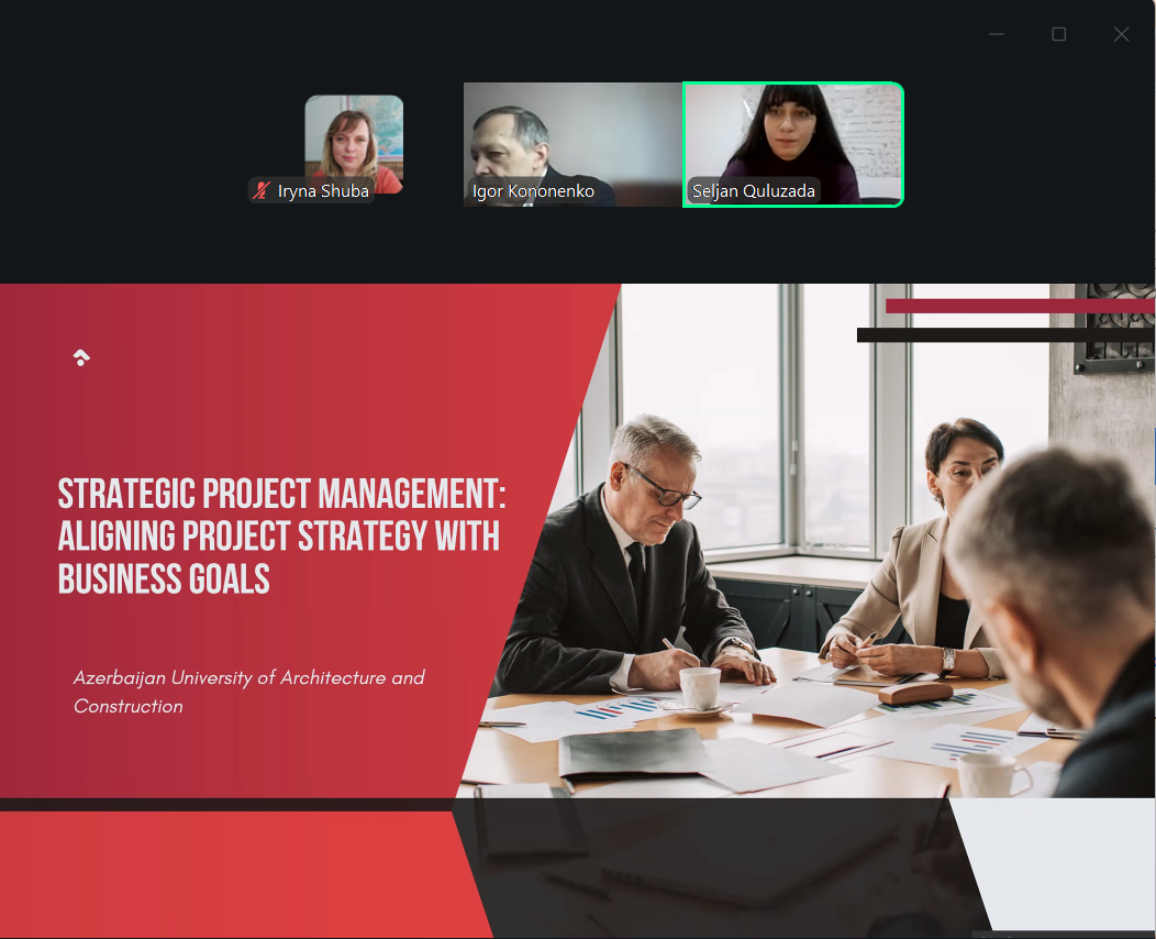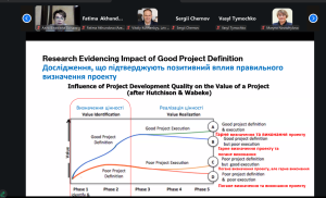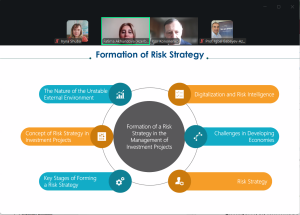 Президент Азербайджанської асоціації управління проєктами, співголова Фонду розвитку Азербайджану та Киргизстану проф. Ігбал БАБАЄВ та Виконавчий директор Азербайджанської Асоціації Управління Проєктами, IPMA Level B, дисертант кафедри Управління Проєктами Азербайджанського університету архітектури та будівництва Фатіма АХУНДОВА зосередили увагу на формуванні стратегії управління ризиками при управлінні інвестиційними проєктами в умовах нестабільного зовнішнього середовища. Вони підкреслили, що характерною рисою інвестиційного клімату, який характеризується невизначеністю, є те, що інвестори все більше цікавляться не короткостроковими спекулятивними акціями чи довгостроковими інвестиціями в нерухомість, а інвестиціями в сучасний бізнес.