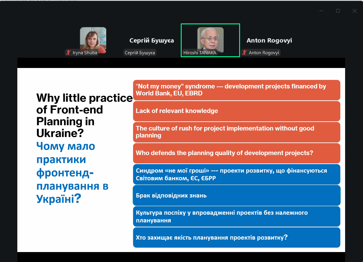 З великою пленарною доповіддю виступив професор Хіроші Танака (Японія), гуру світового рівня в галузі управління проєктами та програмами. Його доповідь була присвячена підвищенню ефективності великих проєктів у нафтогазовій, автомобільній та будівельній галузях. На прикладі Японії він показав, що успіх таких проєктів істотно залежить від якості планування на початку роботи (front-end planning). Він підкреслив вагомість своїх рекомендацій саме для умов України.