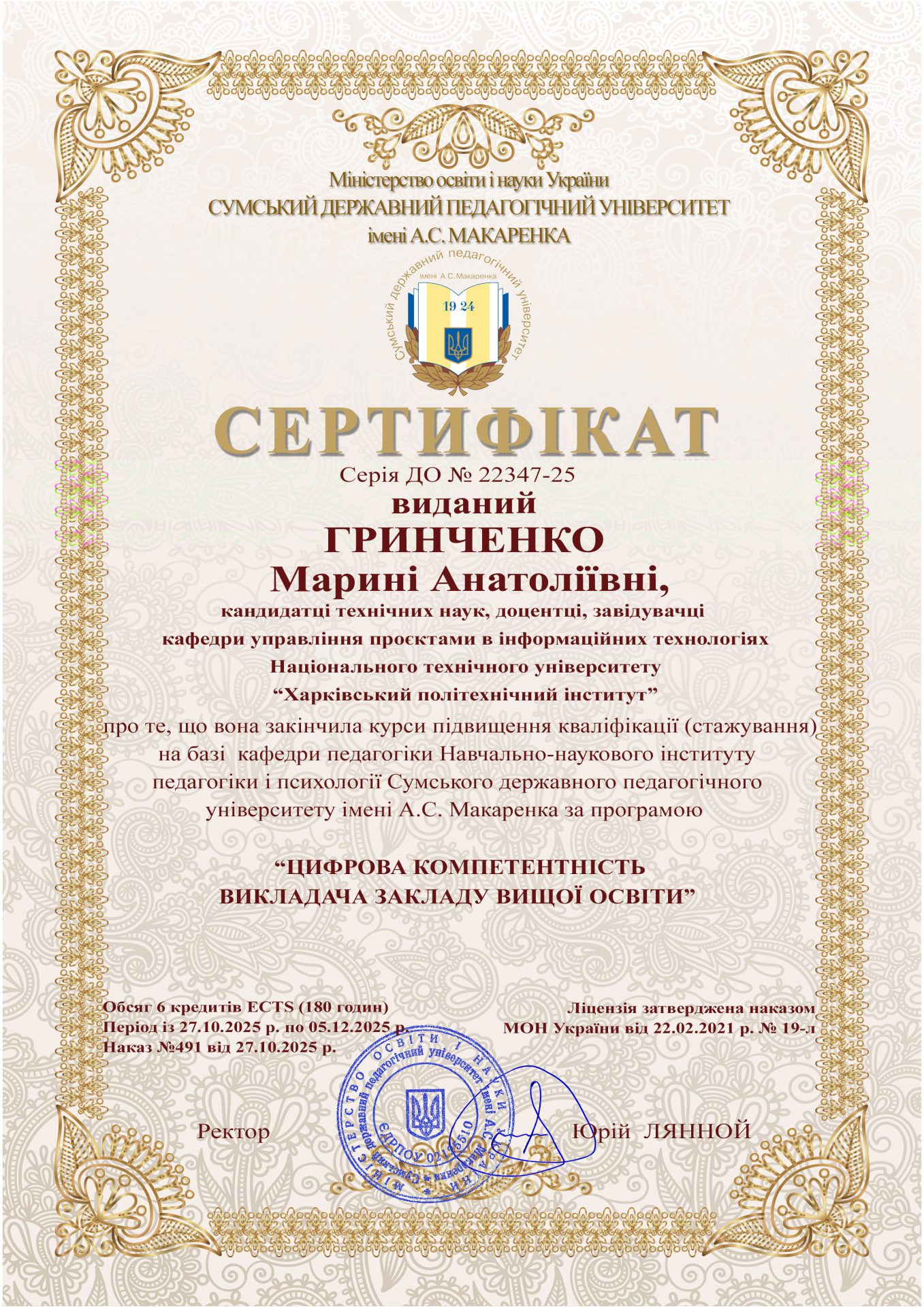 - Підвищення кваліфікації: Сумський державний педагогічний університет імені А.С. Макаренка. Сертифікат Серія ДО № 22347-25. Тема: «Цифрова компетентність викладача закладу вищої освіти», Обсяг годин 180 годин / 6 кредитів ЄКТС (Наказ НТУ «ХПІ» №491 від «27» жовтня 2025р. )
