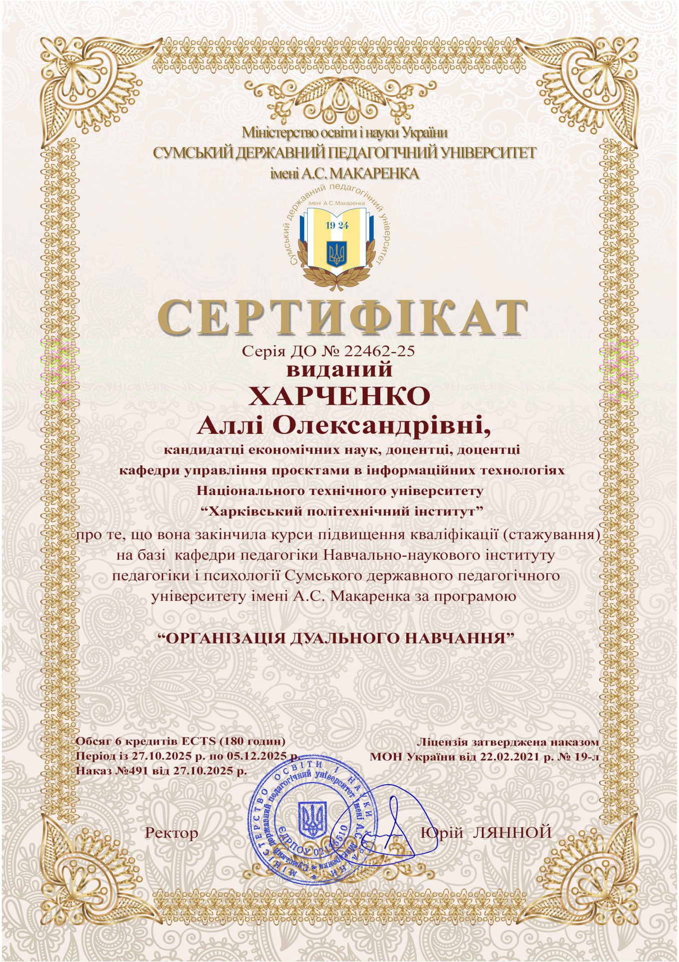 - Підвищення кваліфікації: Сумський державний педагогічний університет імені А.С. Макаренка. Сертифікат Серія ДО № 22462-25. Тема: «Організація синхронного та асинхронного дистанційного навчання», Обсяг годин 180 годин / 6 кредитів ЄКТС (Наказ НТУ «ХПІ» №491 від «27» жовтня 2025р. )