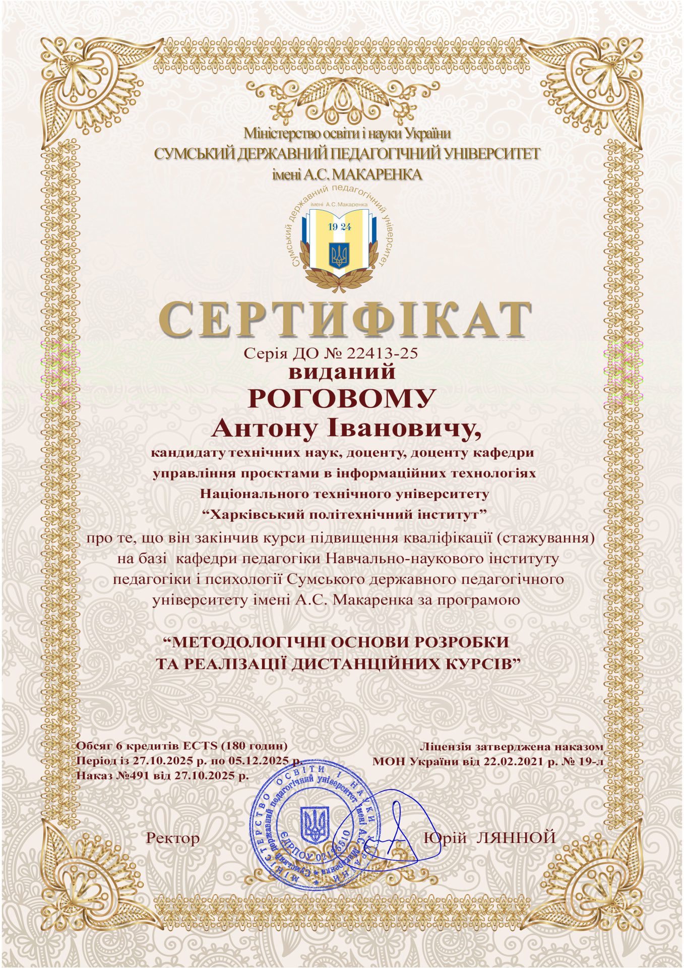 - Підвищення кваліфікації: Сумський державний педагогічний університет імені А.С. Макаренка. Сертифікат Серія ДО № 22413-25. Тема: «Методологічні основи розробки та реалізації дистанційних курсів», Обсяг годин 180 годин / 6 кредитів ЄКТС (Наказ НТУ «ХПІ» №491 від «27» жовтня 2025р. )