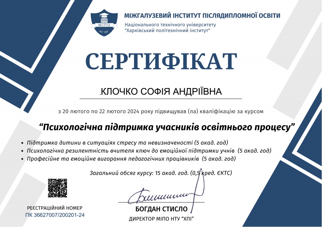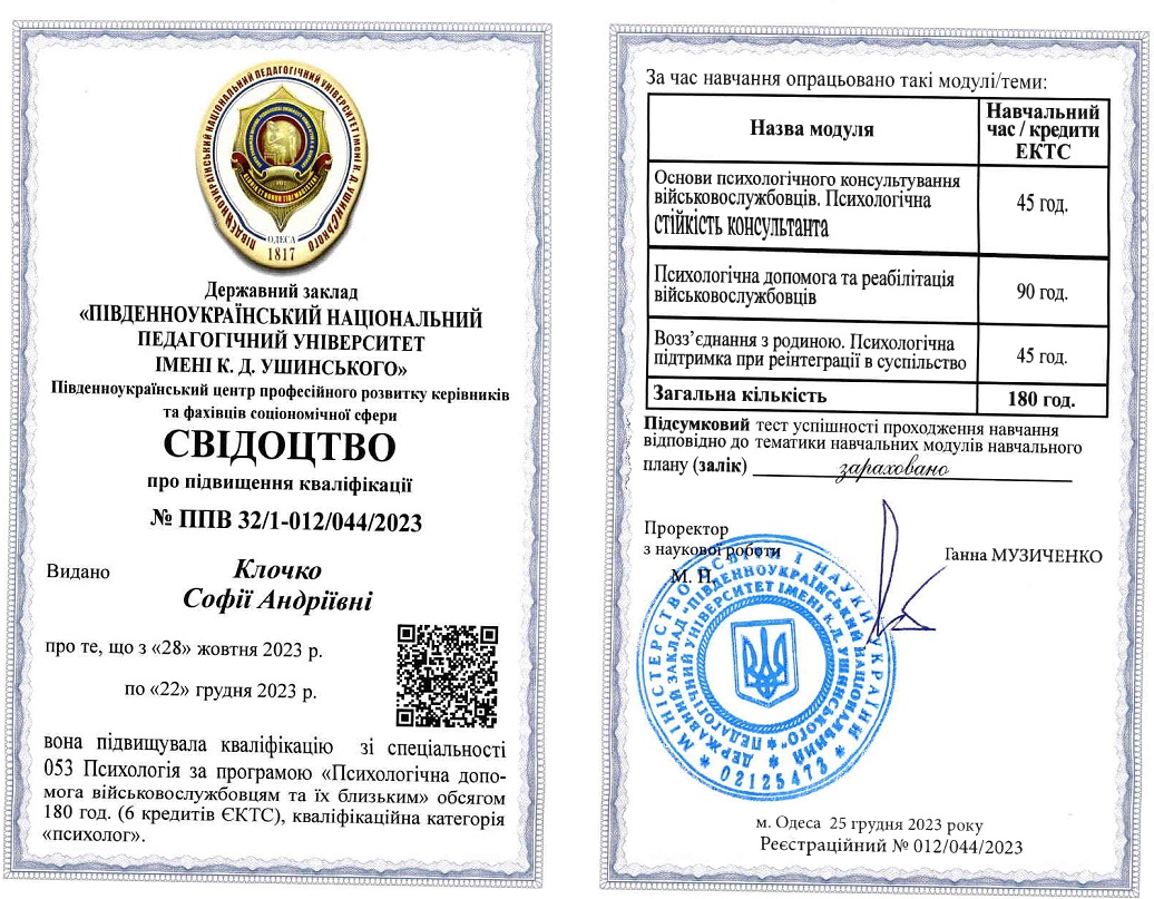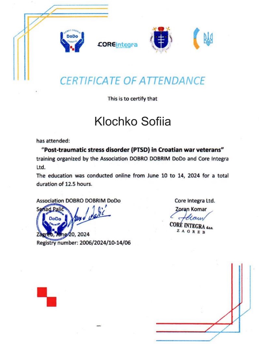 - Курс «Психологічна допомога під час війни» (Psychology Center/ Громадська організація “Агенція екстреної медичної допомоги”, 2024).