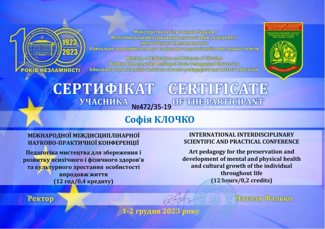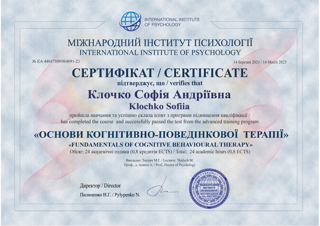 - Курс «Критичне мислення» (Міжнародний інститут психології “International Institute Of Psychology”, 2023).