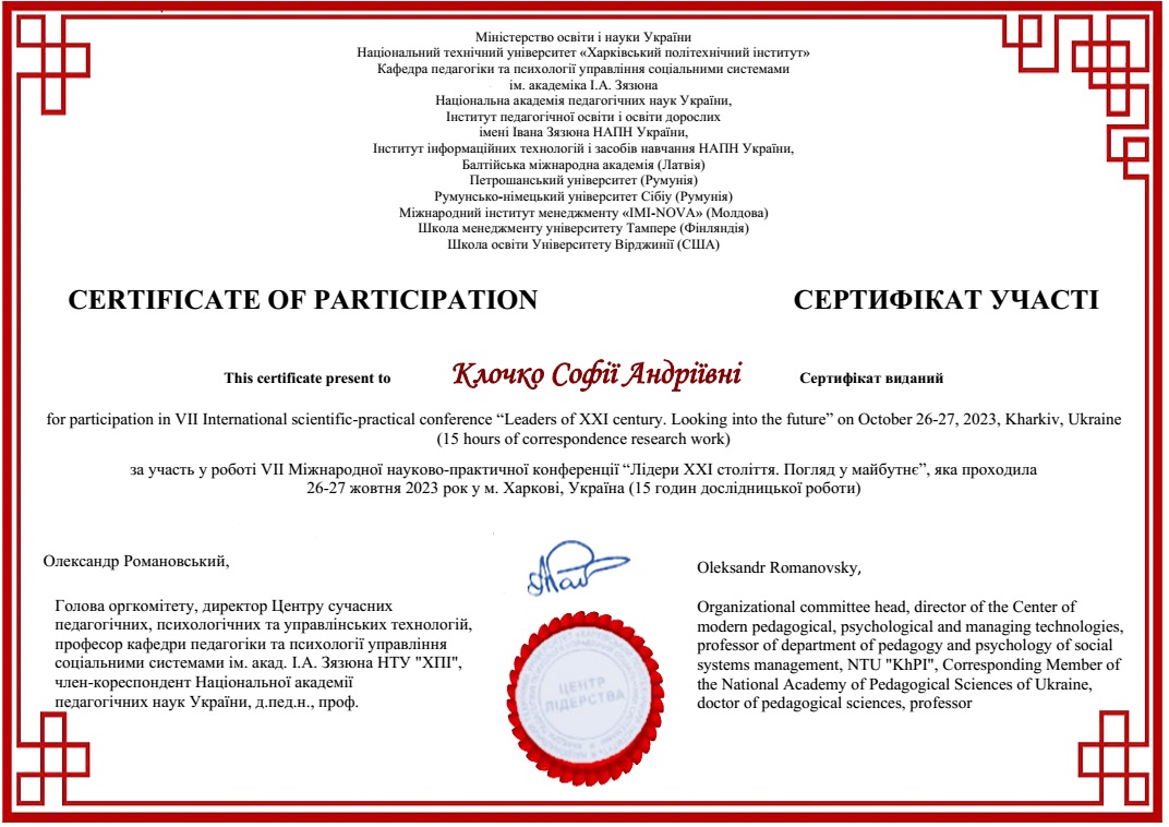 - Клочко С. А. Вплив наративної компетентності на лідерські якості / С. А. Клочко // Лідери XXI століття. Погляд у майбутнє : матеріали 7-ї міжнар. наук.-практ. конф., 26-27 жовтня 2023 р. / заг. ред. О. Г. Романовський ; Нац. техн. ун-т “Харків. політехн. ін-т”. – Електрон. текст. дані. – Харків, 2023. – С. 23-24.