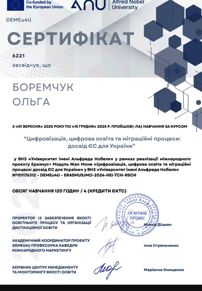 Староста групи СГТ 1123 Боремчук Ольга отримала сучасні знання на онлайн курсі “Цифровізація, цифрова освіта та міграційні процеси: досвід ЄС для України” (120 годин).