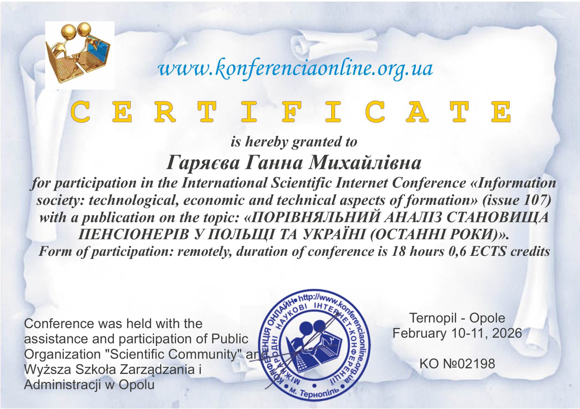 10-11 лютого 2026 року відбулася Міжнародна наукова інтернет-конференція “Інформаційне суспільство: технологічні, економічні та технічні аспекти становлення”. За підсумками конференції було опубліковано збірку тез. Викладачі кафедри права Гаєвая О.В. та Гаряєва Г.М. стали її учасниками та отримали сертифікати: