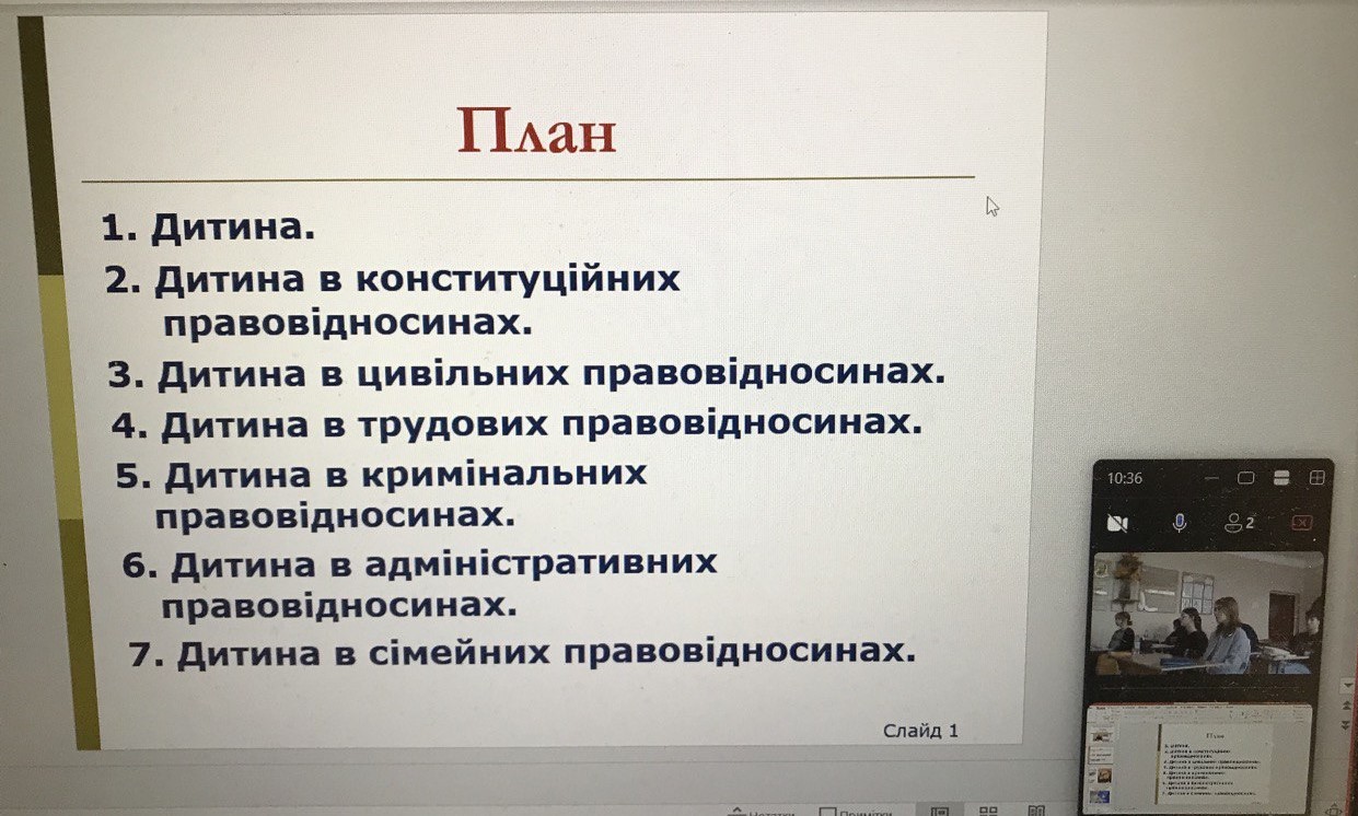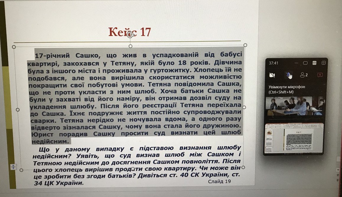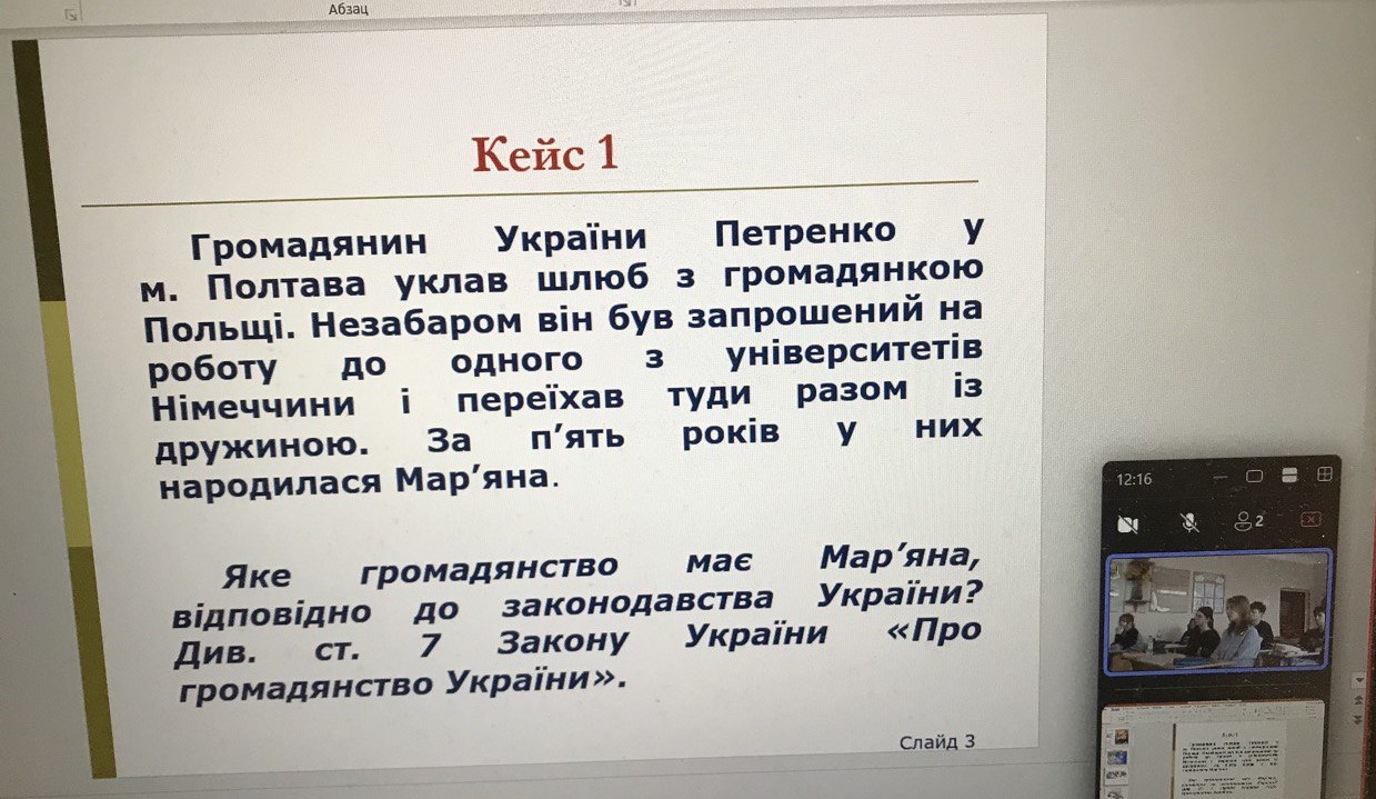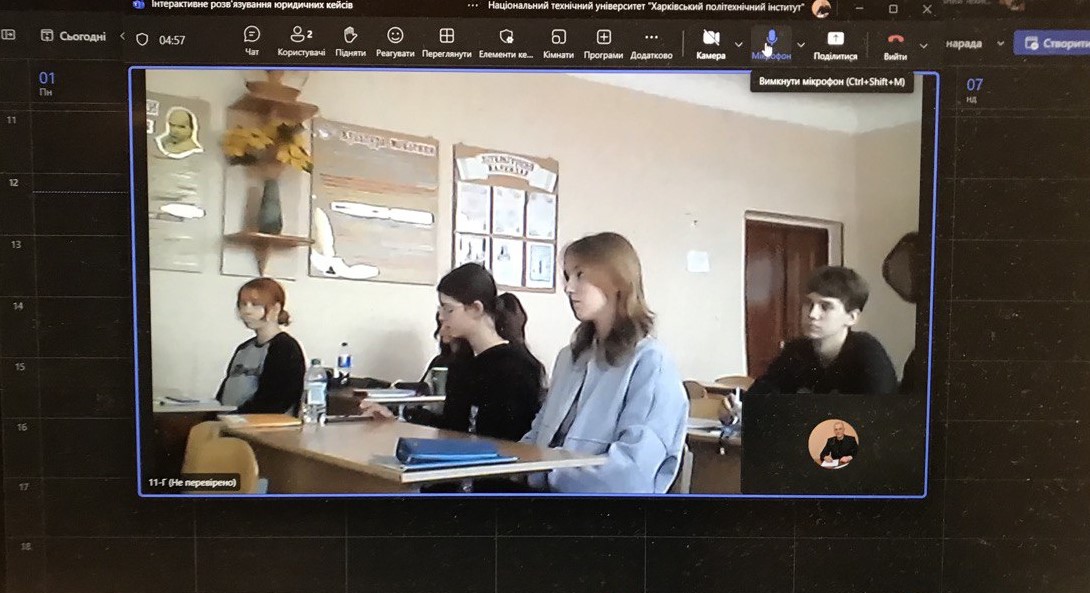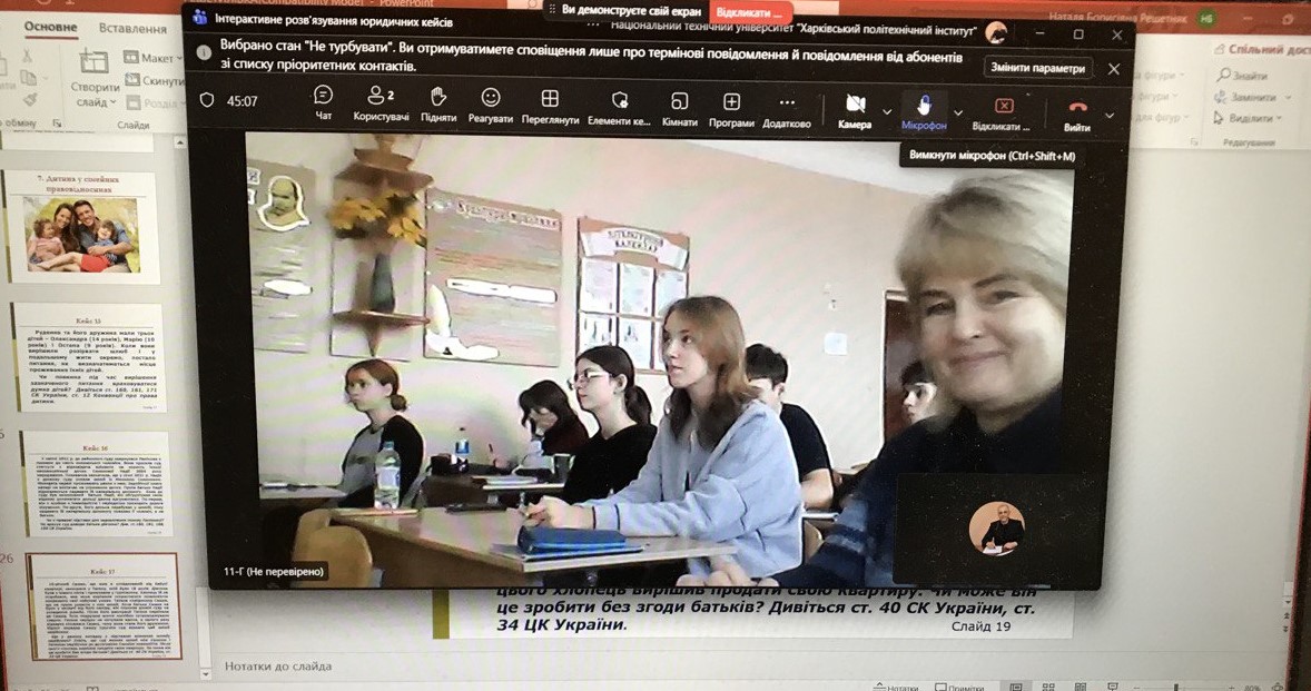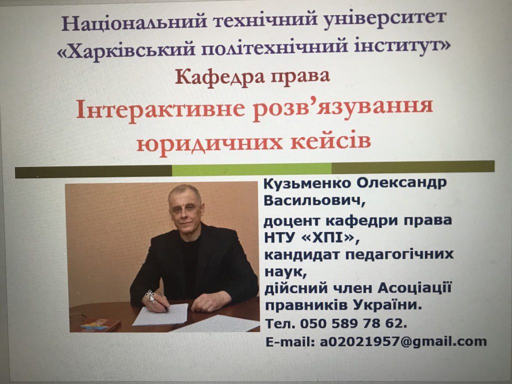 2 грудня 2025 року відбувся профорієнтаційний захід кафедри права за участю одинадцятикласників опорного навчального закладу «Решетилівський ліцей імені І. Л. Олійника» на тему «Інтерактивне розв’язування юридичних кейсів». Згадана зустріч проводилася за спільним планом зазначеного ліцею та НТУ «ХПІ» в межах шкільного тижня «Знання законів – основа свободи». Захід мав формат 40-хвилинного уроку, який провів доцент кафедри права О.В. Кузьменко. Подія відбулася у своєрідному гібридному форматі: школярі за участю вчителя історії та правознавства працювали оф-лайн, а викладач кафедри права – он-лайн, наживо з екрану. Під час цікавої і продуктивної спільної роботи розбиралися реальні та змодельовані життєві ситуації, які мали відношення до різних галузей права – конституційного, цивільного, трудового, адміністративного, сімейного та кримінального. Учні вчилися застосовувати положення чинного вітчизняного законодавства, формулювали права дитини, ставили запитання, доповнювали інформацію О. В. Кузьменка власними прикладами та аргументами.