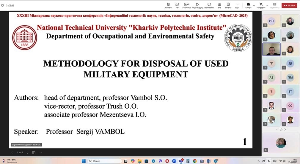 Traditionally, our scientific and pedagogical workers took part in this event and presented their scientific achievements in Subsection 2.4 – Environmental technologies, occupational safety and health, which worked from 14:00 on May 15, 2025. The heads of the subsection were: professor Serhiy Oleksandrovych Vambol (Head of the Department of Occupational and Environment Safety) and associate professor Oleksiy Valeriyovych Shestopalov (Head of the Department of Chemical Engineering and Industrial Ecology).