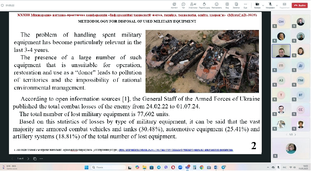 The head of the Department of OandES Serhiy Vambol, on behalf of the authors Vambol S.O., Trush O.O., Mezentseva I.O., made a report on the topic: «Methodology for disposal of used military equipment».