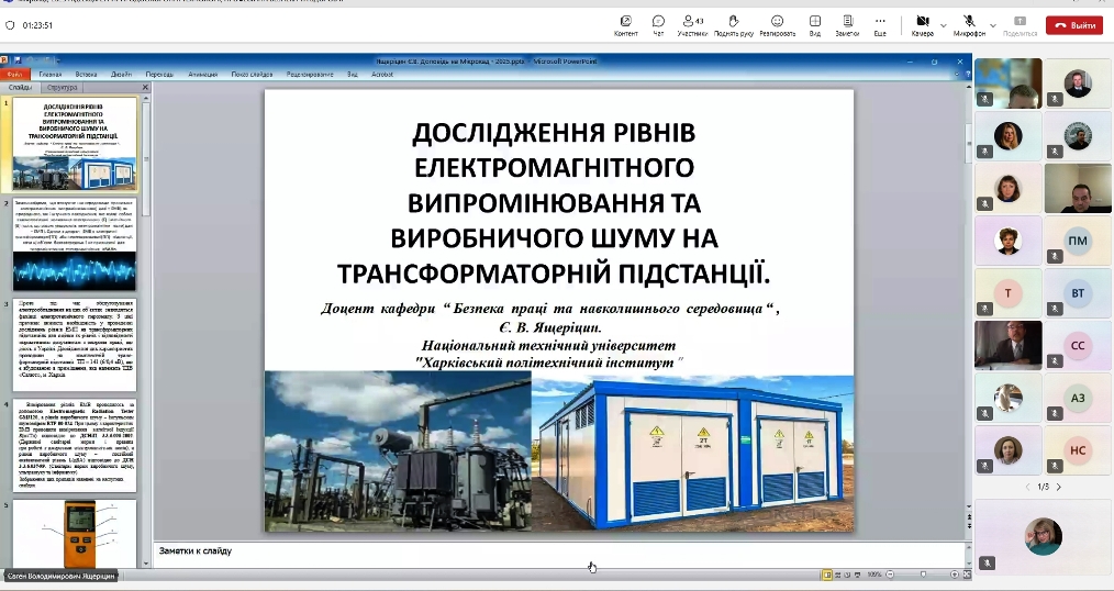 The next speaker, professor of the Department of BPtaNS Lyudmila Vaskovets, made a meaningful scientific report on the topic: «Scientific and paradigmatic principles of regulating the discharge of pollutants into surface waters of Ukraine and the EU.» The scientific report «Study of electromagnetic radiation levels and production noise at a transformer substation» was presented by Yevhen Yascheritsyn, associate professor of the Department of OandES.