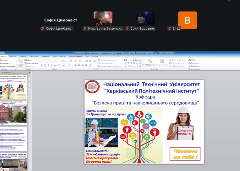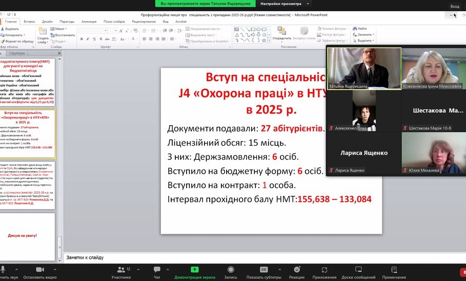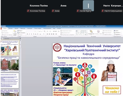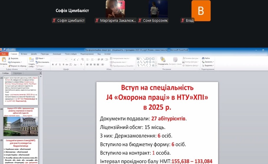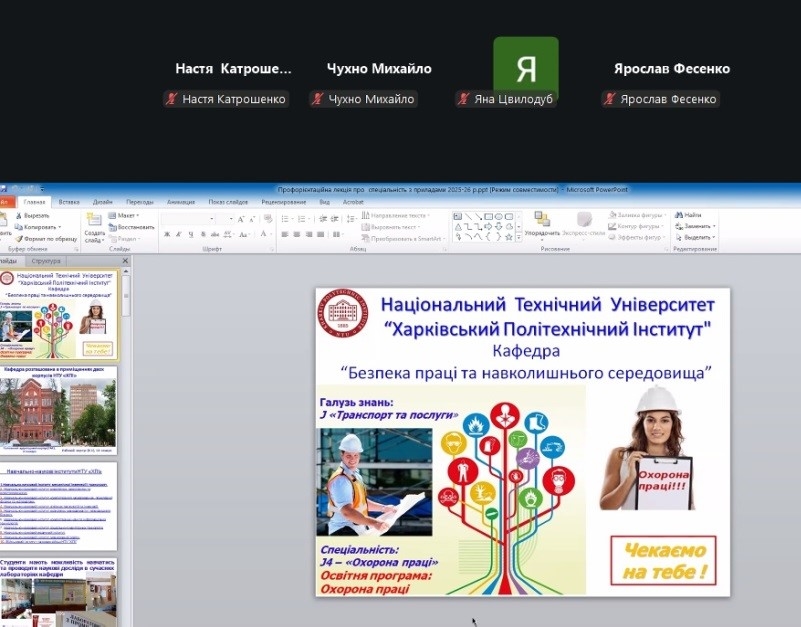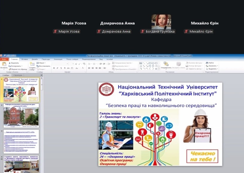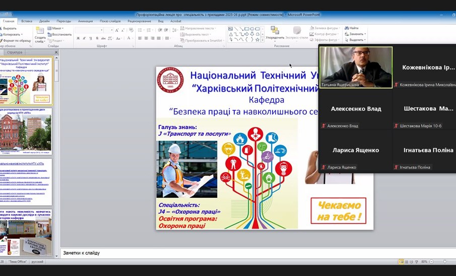 The department’s teachers continue to provide remote career guidance during the current academic year regarding admission to the J4 “Occupational health and safety” educational program “Occupational health and safety”. In January 2026, career guidance events were held with students of the Kharkiv lyceum “Boyko’s Author’s School,” Konotop lyceum №2 (Sumy region), Zidkiv lyceum named after G.I. Kovtun (Kharkiv region), Kharkiv lyceum №87 and Okhtyr lyceum №1 (Sumy region).