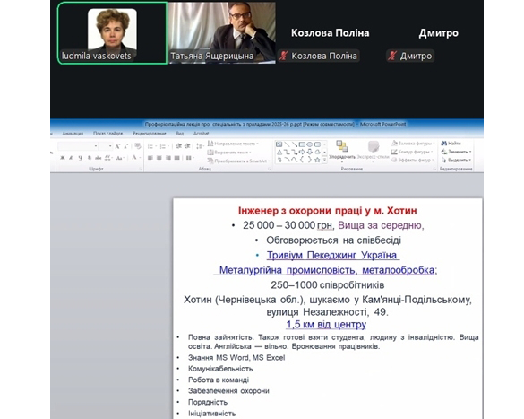 The third remote career guidance event was held on January 19, 2026, by associate professor Y.V. Yashcheritsyn and professor L.A. Vaskovets with students from the G.I. Kovtun lyceum in Zidkiv. It was held with the active support and assistance of the lyceum’s director, Yulia Vasylivna Rezenko and the homeroom teacher of the 11th grade, Svitlana Anatoliivna Shydlovska. Eighteen students participated in the event.