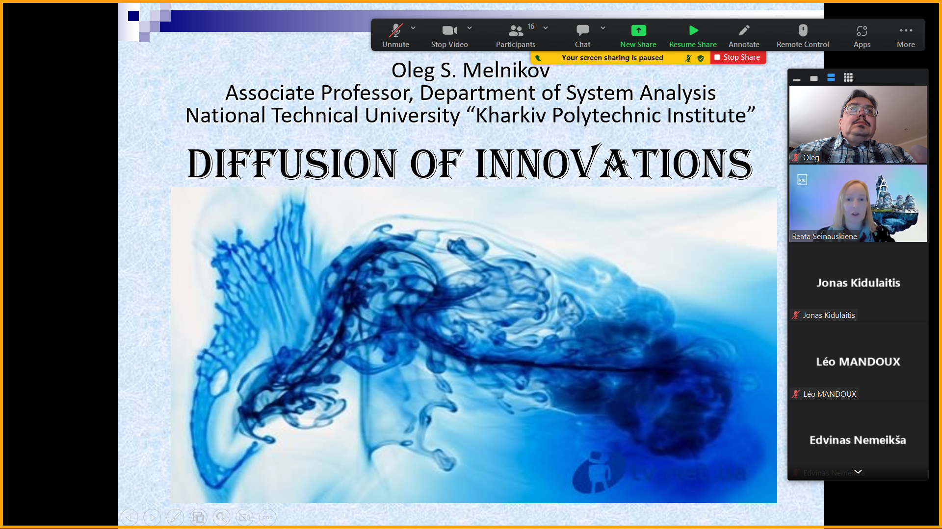 25 квітня 2023 року доцент кафедри системного аналізу та інформаційно-аналітичних технологій НТУ “ХПІ” Мельников Олег Станіславович провів лекцію для магістрів школи економіки та бізнесу Каунаського технологічного університету на тему “Дифузія інновацій” в рамках програми “Global Faculty Week”: Global Faculty Week 2023 – Kaunas University of Technology | KTU