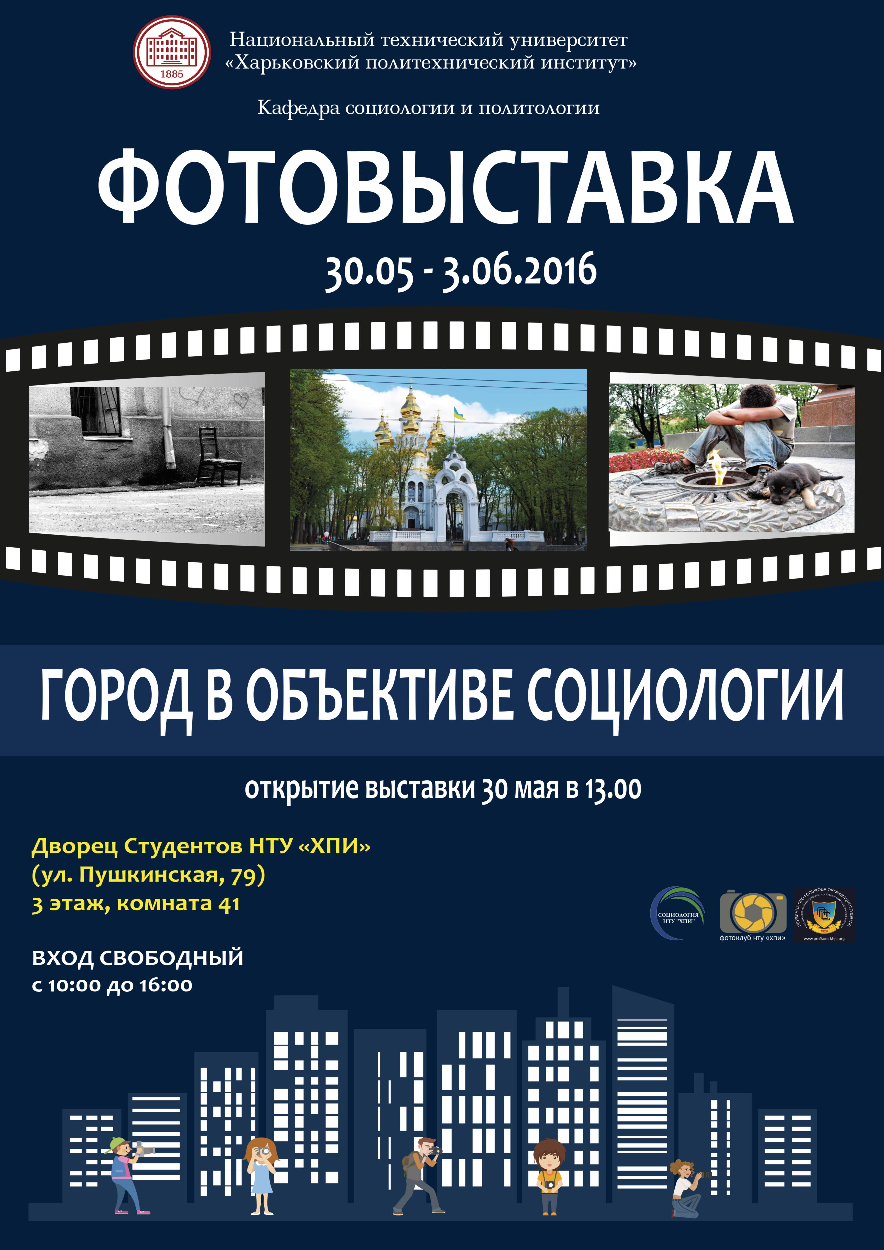 С 30 мая по 3 июня во Дворце студентов НТУ «ХПИ» пройдет фотовыставка «Город в объективе социологии». Цель выставки – привлечение внимания общественности к социальным проблемам города. На экспозиции будут представлены работы студентов и преподавателей вузов, активистов гражданского общества.