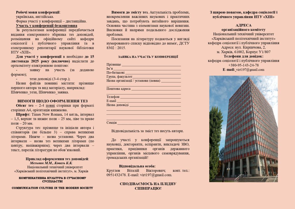 12 грудня 2025 р. кафедрою соціології і публічного управління буде проведено ХІІ Міжнародну науково-практичну конференцію «Розвиток сучасного українського суспільства в соціологічному вимірі». Конференція присвячена 140-річчю Національного технічного університету “Харківський політехнічний інститут”.