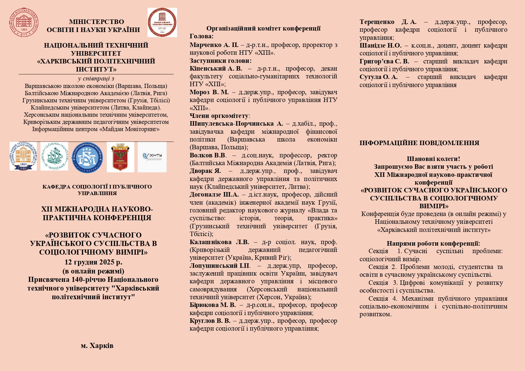 12 грудня 2025 р. кафедрою соціології і публічного управління буде проведено ХІІ Міжнародну науково-практичну конференцію «Розвиток сучасного українського суспільства в соціологічному вимірі». Конференція присвячена 140-річчю Національного технічного університету “Харківський політехнічний інститут”.
