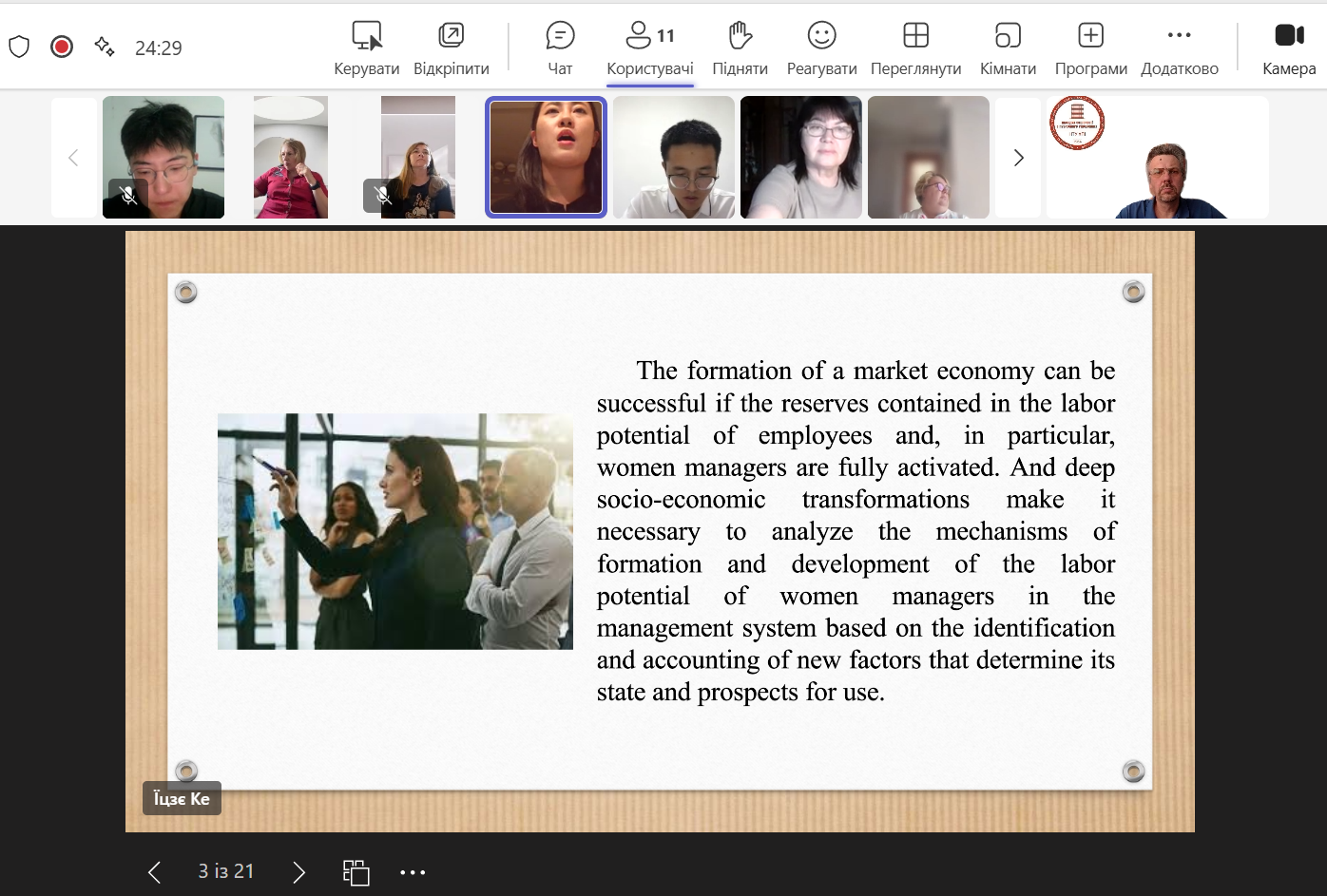 1) Ке Їцзє (Ke Yijie) «Стереотипи щодо жінок керівників в сфері управління економічною діяльністю» (наукова керівниця – к. соц. наук, доцентка Шанідзе Н.О.). За результатами захисту Ке Їцзє (Ke Yijie) отримала рекомендацію від екзаменаційної комісії на вступ до аспірантури НТУ «ХПІ»;
