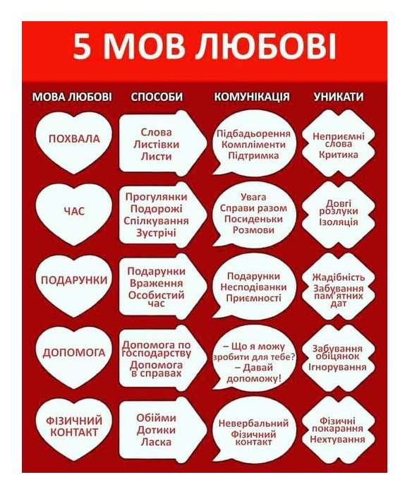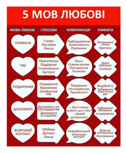 Всього Гері Чепмен виділив 5 різних мов (або ж моделей поведінки), за якими людина будує стосунки з партнером. Їх розуміння неодмінно допоможе покращити стосунки з коханою людиною.