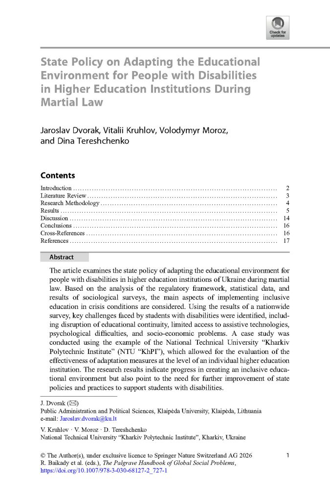 Нелегким був шлях включення до монографії розділу «Державна політика щодо адаптації освітнього середовища для людей з інвалідністю у вищих навчальних закладах під час воєнного стану», створеного міжнародним авторським колективом у складі Дворака Я. – завідувача кафедри державного управління та політології Клайпедського університету (Литва), Мороза В. М. – завідувача кафедри соціології і публічного управління; Круглова В. В. – професора кафедри соціології і публічного управління та Терещенко Д. А. – професорки кафедри соціології і публічного управління, адже рецензування мало довготривалий характер та суворі академічні підходи до якості дослідження, як зазвичай це є у тематичних серіях видань Springer.