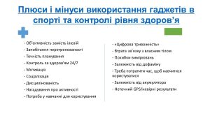 Під час лекції було розглянуто найбільш популярні групи сучасних девайсів які можуть допомогти підвищити фізичну форму та зберегти здоров’я. Акцентовано увагу на найбільш надійних з точки зору відсутності похибок девайсах. Присутні долучалися до обговорення питань лекції.