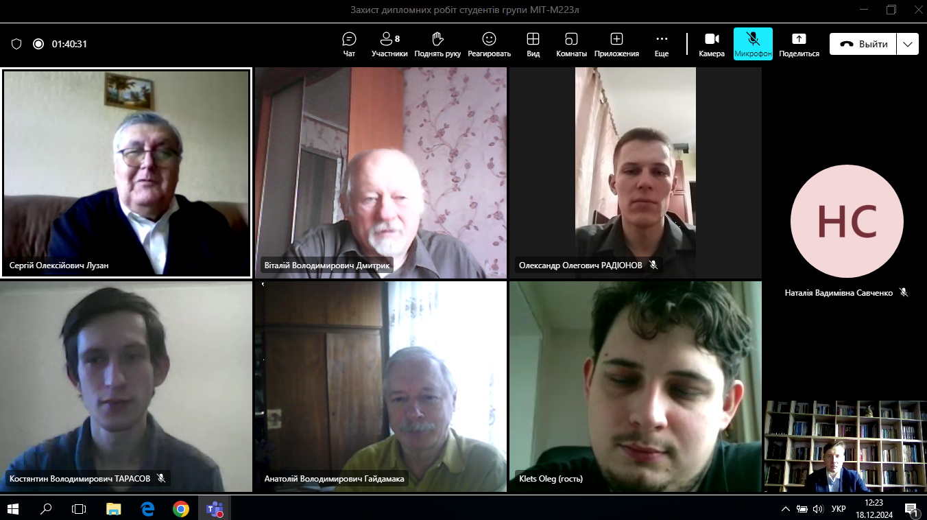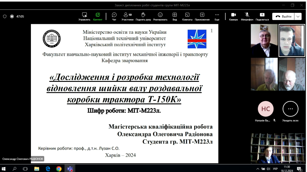 18 грудня 2024 року Державна комісія у складі: голови комісії – професора кафедри деталей машин та гідропневмосистем НТУ “ХПІ”, доктора технічних наук Гайдамаки Анатолія Володимировича; членів комісії – завідувача кафедри зварювання НТУ “ХПІ”, доктора технічних наук Лузана Сергія Олексійовича; професора кафедри зварювання НТУ “ХПІ”, доктора технічних наук Дмитрика Віталія Володимировича, доцента кафедри зварювання НТУ “ХПІ”, кандидата технічних наук Маршуби Вячеслава Павловича; секретаря комісії – інженера кафедри Савченко Наталії Вадимівни провела захист здобувачів групи МІТ-М223л.