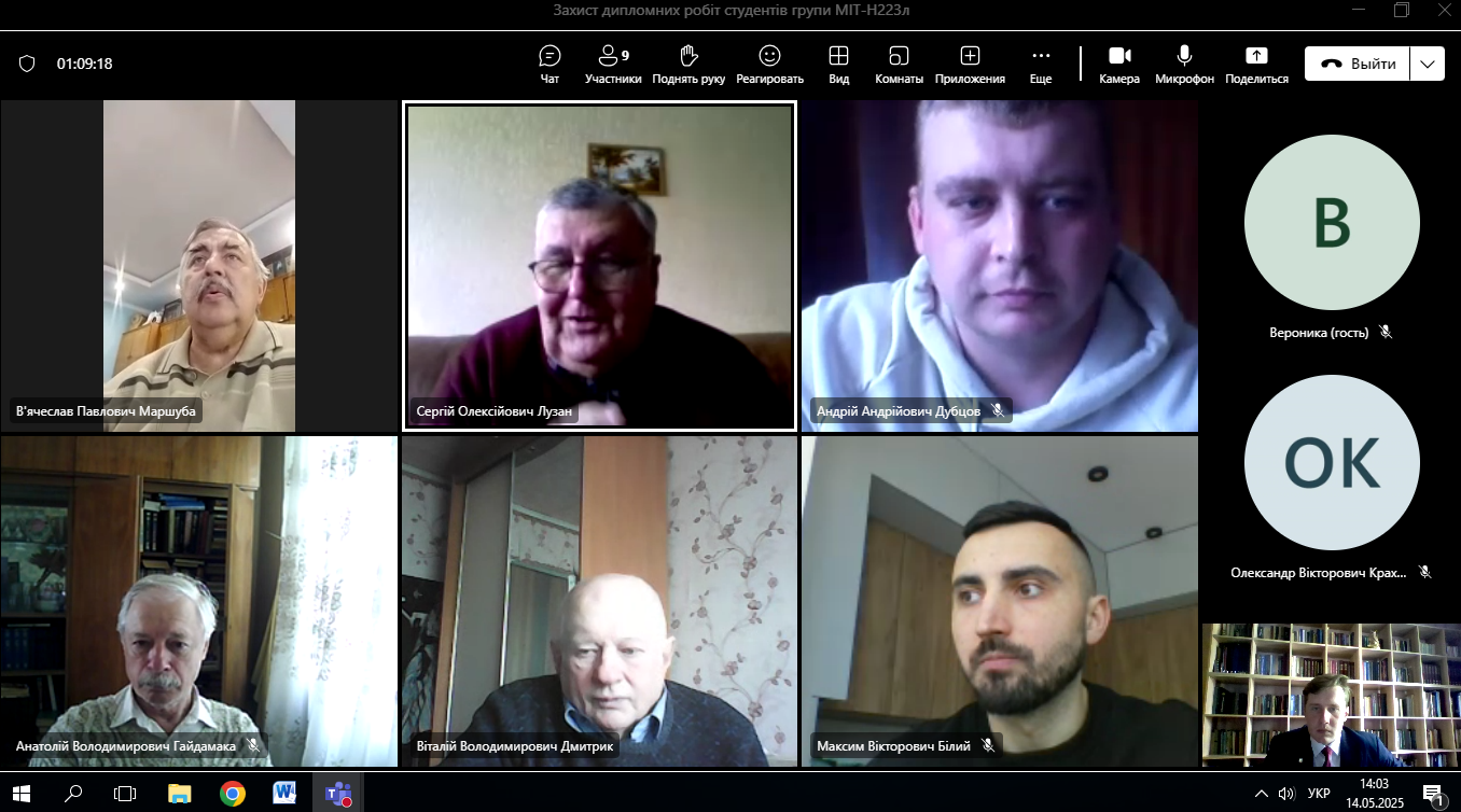 14 травня 2025 року Державна комісія у складі: голови комісії – професора кафедри деталей машин та гідропневмосистем НТУ “ХПІ”, доктора технічних наук Гайдамаки Анатолія Володимировича; членів комісії – завідувача кафедри зварювання НТУ “ХПІ”, доктора технічних наук Лузана Сергія Олексійовича; професора кафедри зварювання НТУ “ХПІ”, доктора технічних наук Дмитрика Віталія Володимировича, доцента кафедри зварювання НТУ “ХПІ”, кандидата технічних наук Маршуби Вячеслава Павловича; секретаря комісії – завідувача лабораторією кафедри Гордієнка Володимира Павловича провела захист здобувачів групи МІТ-Н223л.
