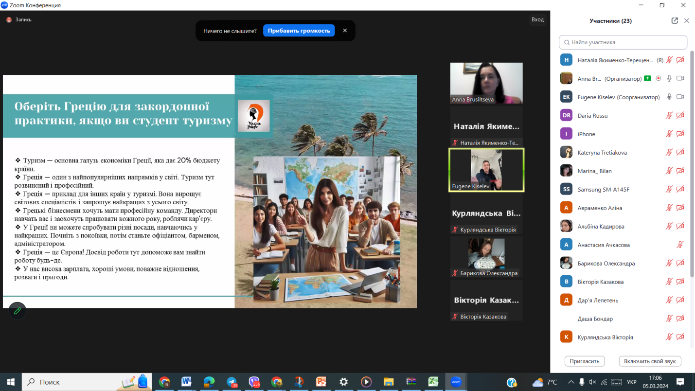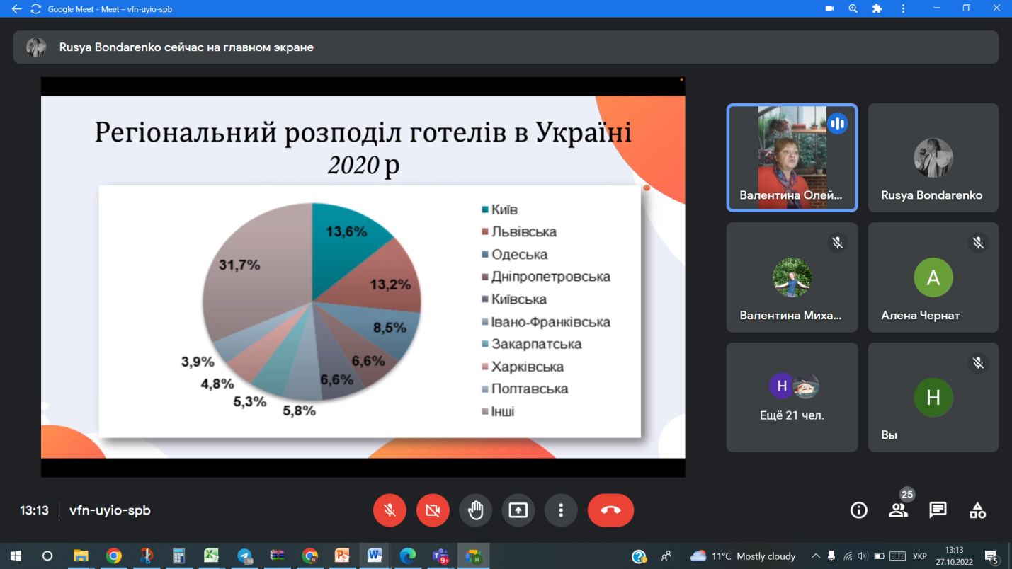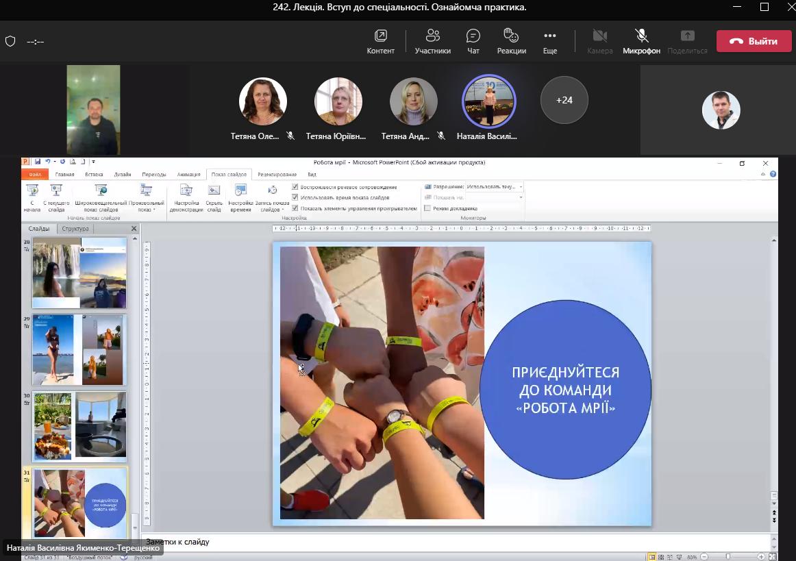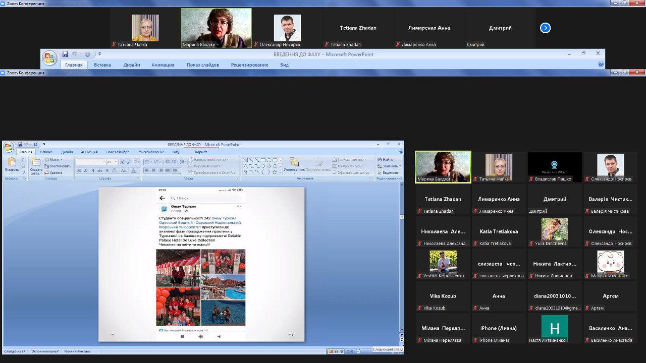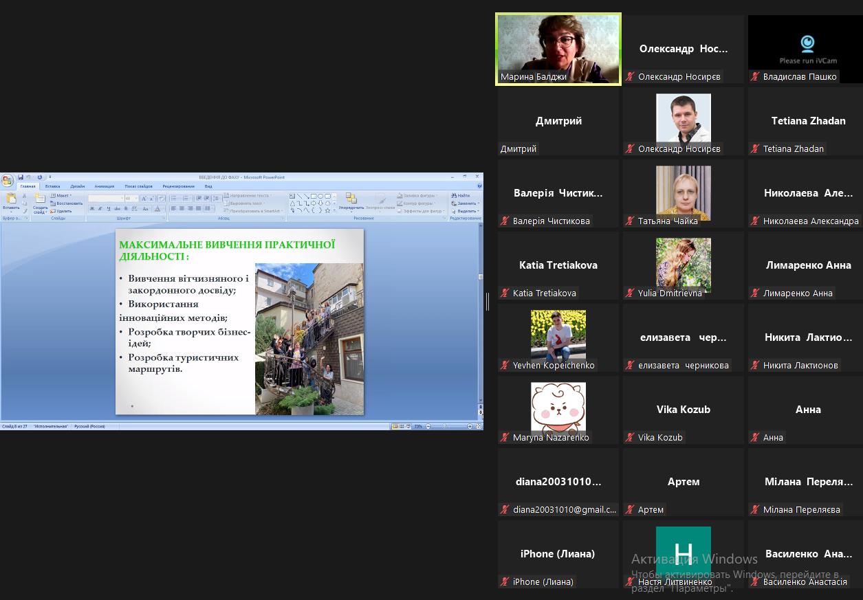 Викладачі та студенти кафедри відвідали онлайн-лекцію професора Одеського національного морського університету Балджи Марини Дмитрівни на тему “Зміст, характер та сфера майбутньої діяльності випускників спеціальностей 241 “Готельно-ресторанна справа” та 242 “Туризм”
