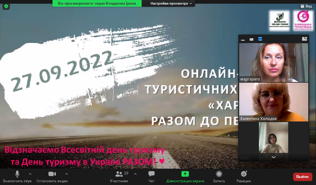 27 вересня з нагоди міжнародного Дня Туризму викладачі та студенти кафедри туризму і готельно-ресторанного бізнесу взяли участь у онлайн-марафоні туристичних ініціатив «Харківщина: разом до перемоги!», який проводився на базі організації “Харківський організаційно-методичний центр туризму”.