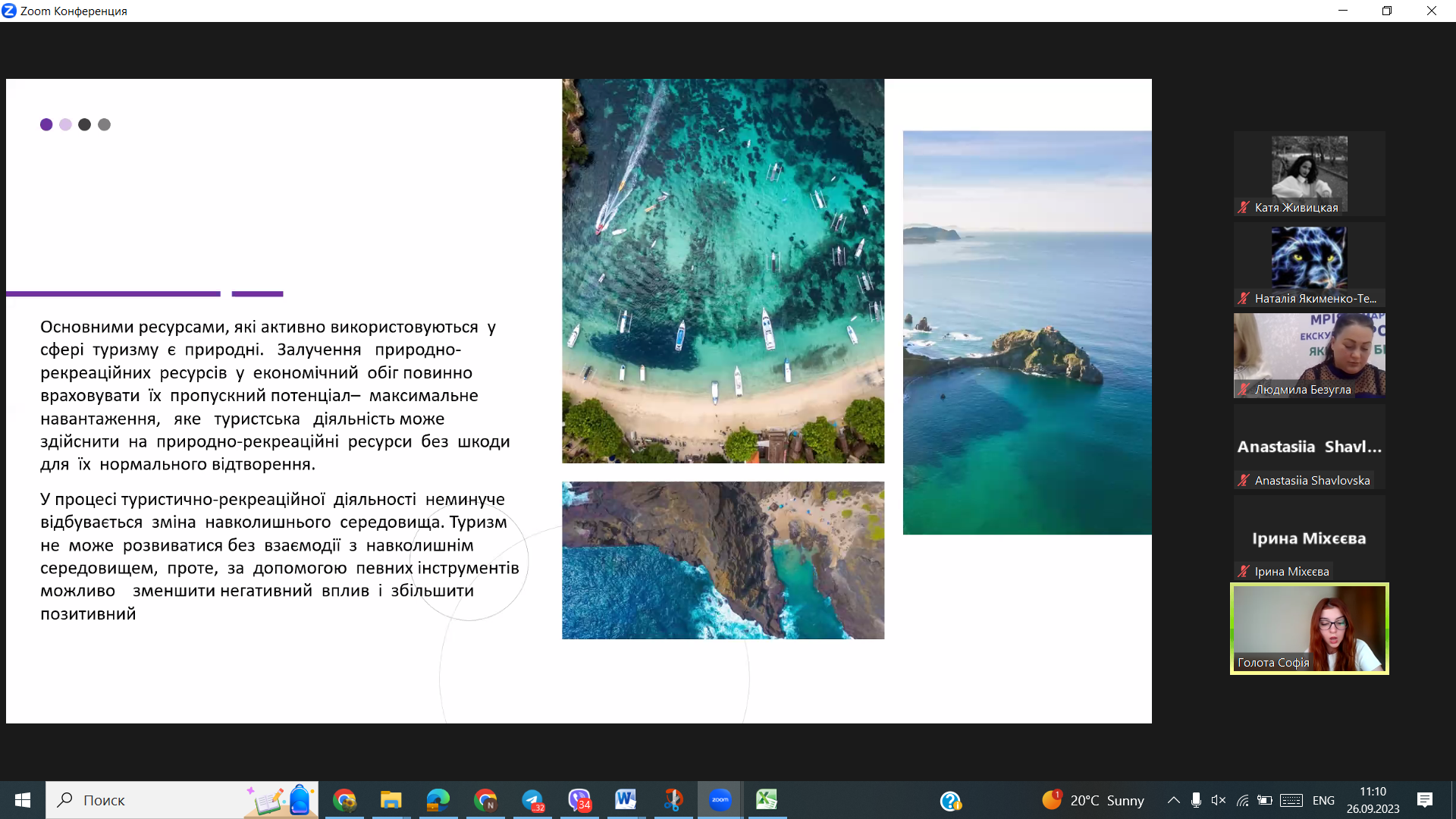 Студентка Катерина ТРЕТЯКОВА презентувала доповідь «Сучасні тренди розвитку туризму Японії», студентка Валерія ЧИСТИКОВА підготувала тези за темою «Туристично-курортний потенціал Швейцарії», а студентка Анастасія ЛИТВИНЕНКО – тези «Розвиток рекреаційно-оздоровчого туризму в Ізраїлі».