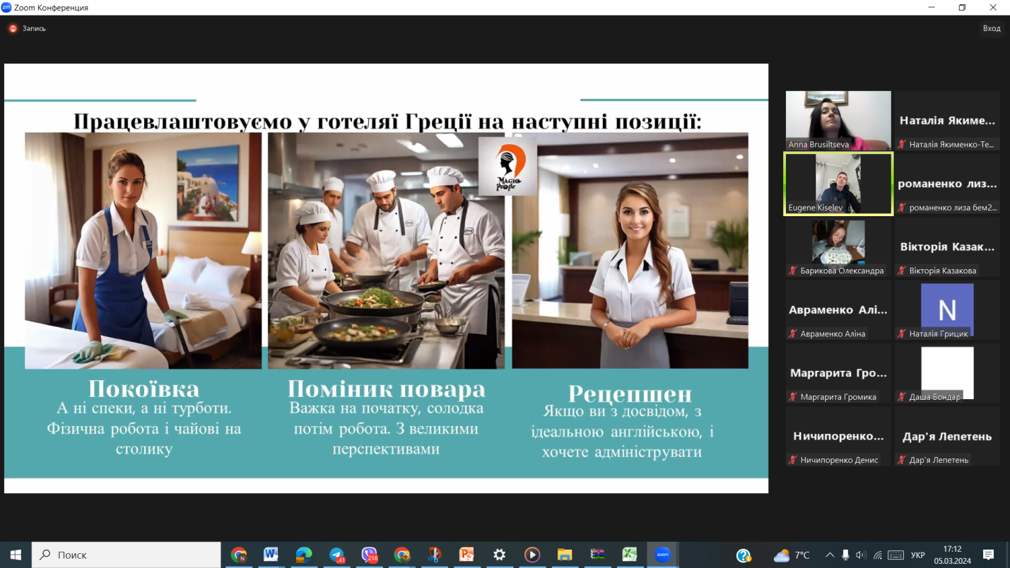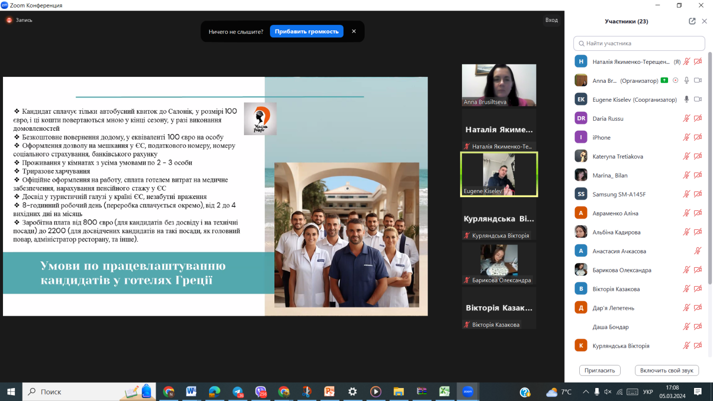 В рамках участі у цій програмі для студентів було презентовано можливості працевлаштування в галузі гостинності за кордоном (Туреччина, Єгипет, Кіпр) на період травень-жовтень 2023 року, отримання нового професійного досвіду, початку отримання власного заробітку (орієнтовно ставка у розмірі 450-700 $/місяць + чайові (150 $/місяць).