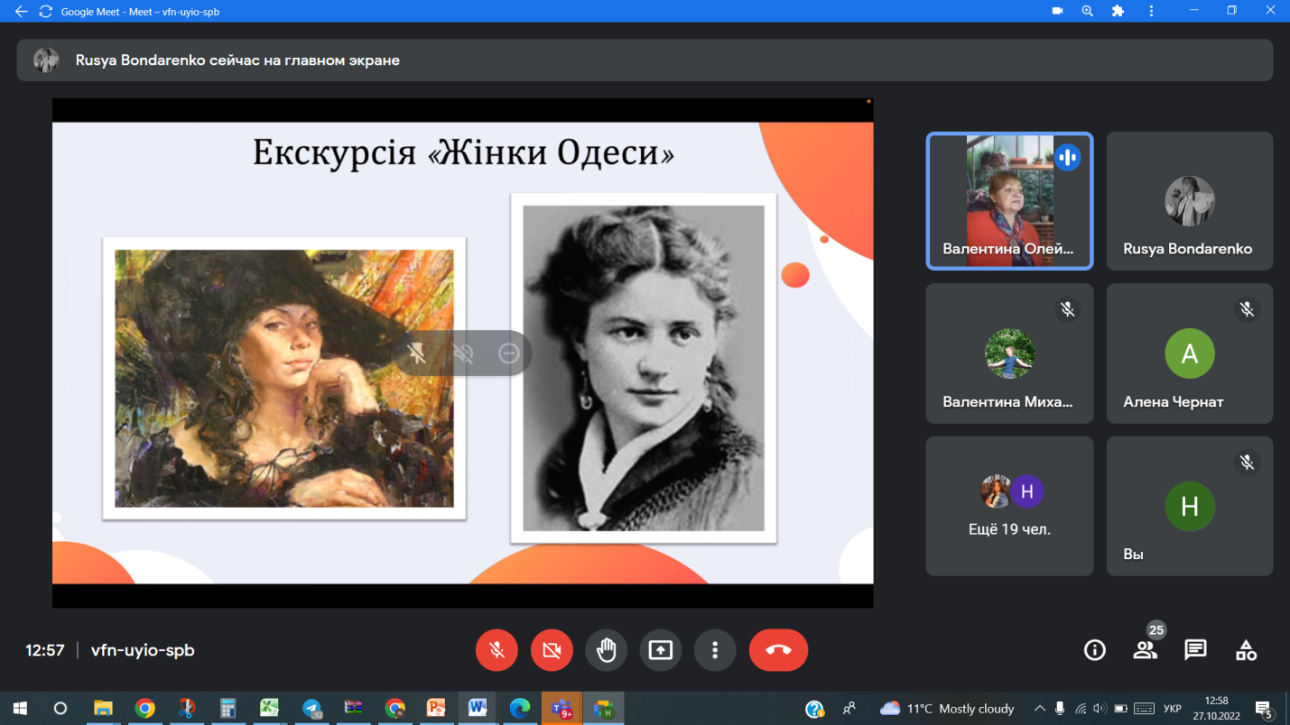 Валентина Дем’янівна підготувала цікаву презентацію зі світлинами найголовніших туристичних локацій, які відомі на весь світ. Вулиці Дерибасівська, Рішельєвська, Приморський бульвар, відомі архітектурні памятки: будівля Одеської опери, Археологічного музею, Потьомкінські сходи, будівля міської ради, Парк Шевченка, Пасаж, морський вокзал, 12-й стілець, міський сад, Аркадія, Ланжерон – це лише мала частина тих локацій, про історію та особливості яких розповіла спікерка.