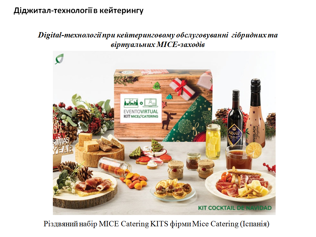 Наразі ситуація «зламу» застарілих бізнес-моделей підштовхує кейтерингові агенції, що спеціалізуються на обслуговуванні MICE-індустрії, до пошуку нових інноваційних технологій та рішень. Digital-технології надають безліч можливостей, якими саме час користуватися. Зокрема, є перспективними та затребуваними такі реалізації digital-технологій, як цифрові ваучери, гастро-меппінг, набори для он-лайн кейтерингу та ін. Проте слід мати на увазі, що фрагментарне застосування digital-технологій не може бути основою для довгострокового успіху. Необхідна не просто діджиталізація (що передбачає удосконалення наявних бізнес-моделей), а digital-трансформація (що передбачає формування та впровадження принципово нових, інноваційних бізнес-моделей).