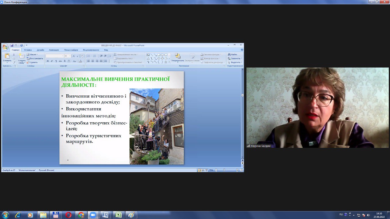 27 вересня 2022 р. науково-педагогічні працівники та студенти кафедри, які навчаються за освітніми програмами “Готельно-ресторанна справа” та “Туристичний бізнес” були присутні на онлайн-лекції доктора економічних наук, професора Одеського національного морського університету Балджи Марини Дмитрівни на тему “Зміст, характер та сфера майбутньої діяльності випускників спеціальностей 241 “Готельно-ресторанна справа” та 242 “Туризм”.