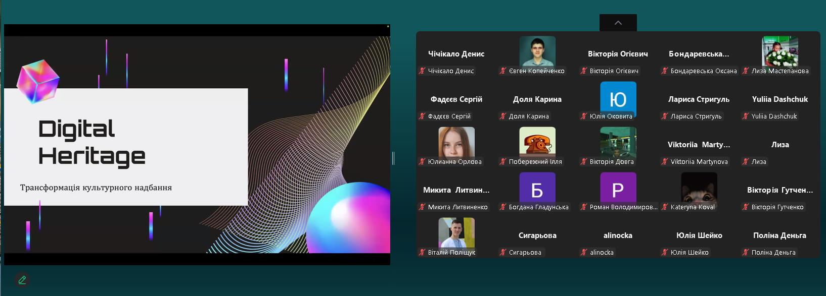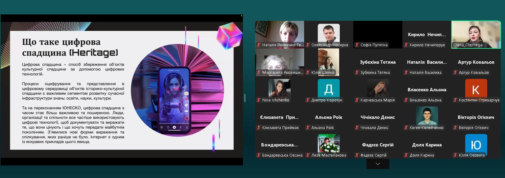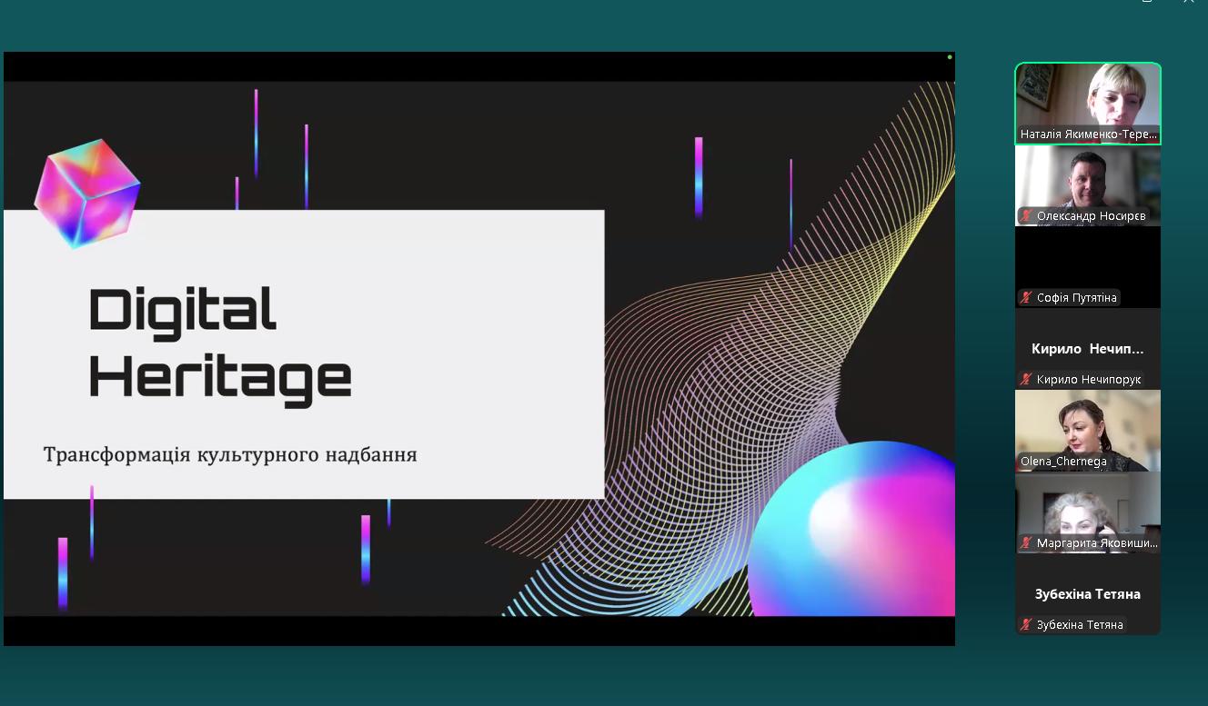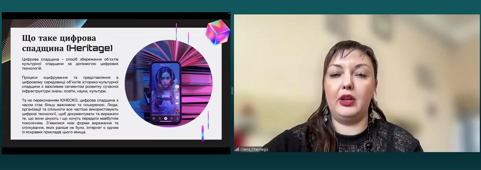 Темою зустрічі стала «Цифрова спадщина. Трансформація культурного надбання», а спікерка розповіла про оцифрування та виготовлення й збереження цифрових копій об’єктів матеріальної та нематеріальної культурної спадщини.