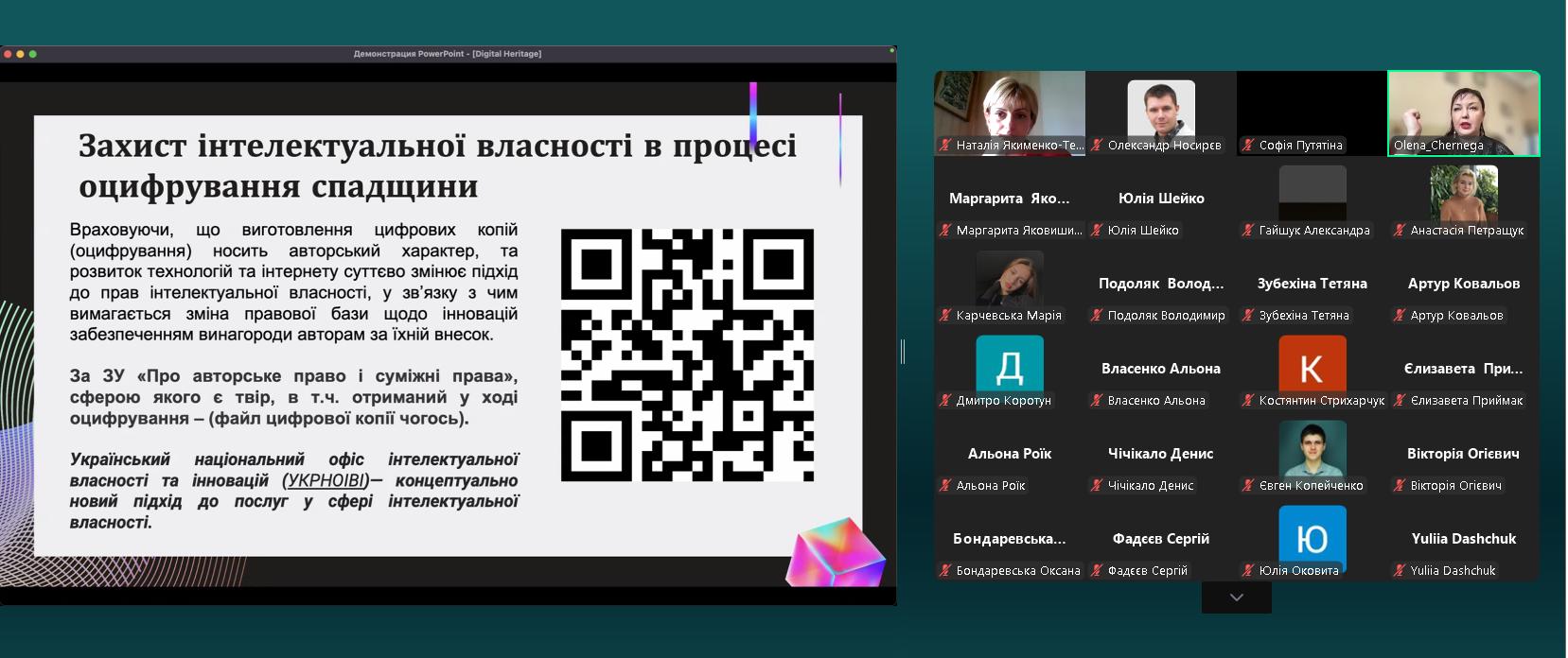 Окрема увага була приділена українським кейсам, особливо крізь призму необхідності створення цифрових копій обʼєктів культури та нематеріальної спадщини у звʼязку з високою загрозою їхньої втрати внаслідок війни. Цікавим блоком було й питання захисту інтелектуальної власності в процесі оцифрування спадщини, оскільки потрібно враховувати, що виготовлення цифрових копій (оцифрування) має авторський характер, та розвиток технологій та інтернету суттєво змінює підхід до прав інтелектуальної власності, у звʼязку з чим вимагається зміна правової бази щодо інновацій забезпеченням винагороди авторам за їхній внесок.