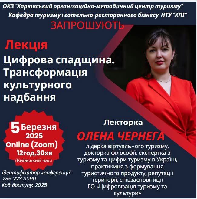 05 березня 2025 року викладачі та здобувачі кафедри туризму і готельно-ресторанного бізнесу долучились до онлайн-лекції від практика сфери туризму і гостинності Олени ЧЕРНЕГИ, лідерки віртуального туризму, докторки філософії, експертки з туризму та цифри туризму в Україні, практикині з формування туристичного продукту, репутації території, співзасновниці ГО «Цифровізація туризму та культури».