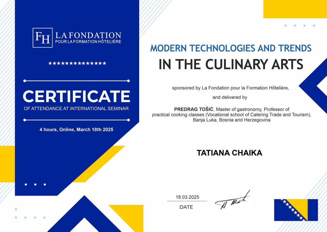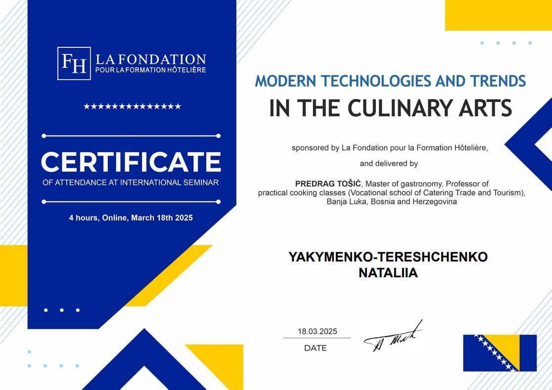 18 березня 2025 року викладачі кафедри доєднались до роботи міжнародного онлайн-семінару «Сучасні технології та тренди в кулінарному мистецтві» від кафедри готельно-ресторанного бізнесу Одеського національного технологічного університету. Захід проводився англійською мовою за підтримки La Fondation pour la Formation Hôtelière та представив учасникам всебічний огляд інноваційних кулінарних технологій.