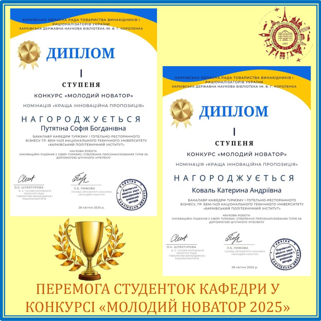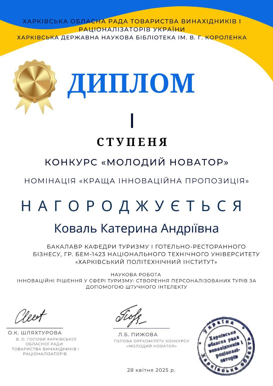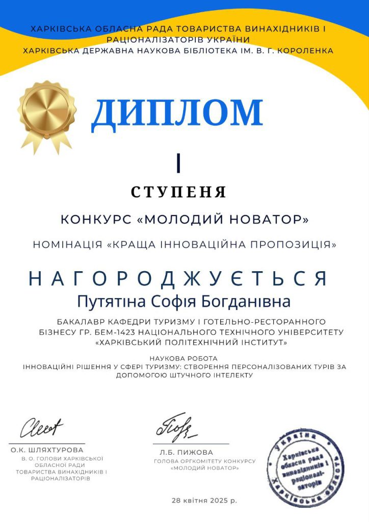 Кафедра туризму і готельно-ресторанного бізнесу представила на конкурс наукову розробку своїх найталановитіших студенток: Софії ПУТЯТІНОЇ та Катерини КОВАЛЬ, які навчаються за спеціальністю J3 Туризм та рекреація. Представлена розробка мала назву «Інноваційні рішення у сферах туризму: створення персоналізованих турів за допомогою штучного інтелекту», яку студентки виконували під керівництвом доцентки кафедри Катерини КУНИЦІ.