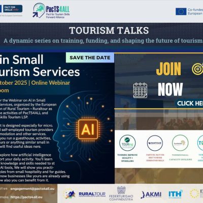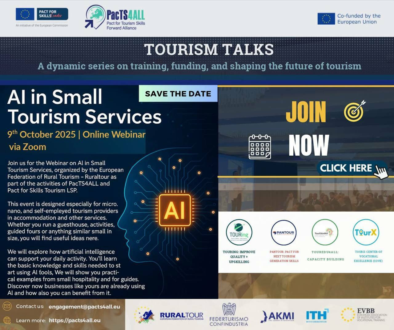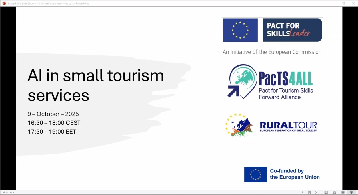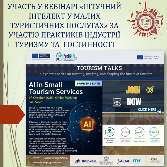 09 жовтня 2025 р. викладачі та здобувачі кафедри туризму і готельно-ресторанного бізнесу НТУ «ХПІ» доєднались до роботи онлайн-вебінару «ШІ в туристичних послугах», який проводився англійською мовою та був організований Європейською федерацією сільського туризму – Ruraltour у межах ініціатив PacTS4ALL та Pact for Skills Tourism LSP.