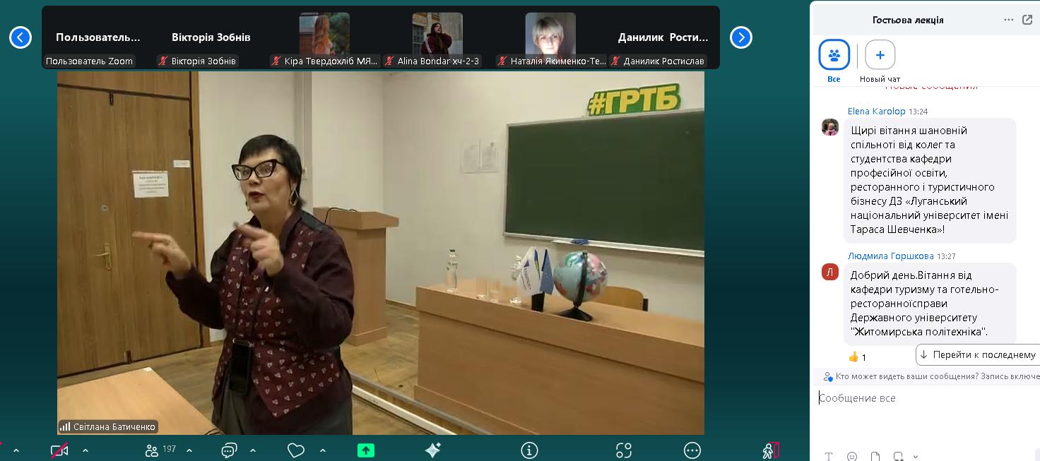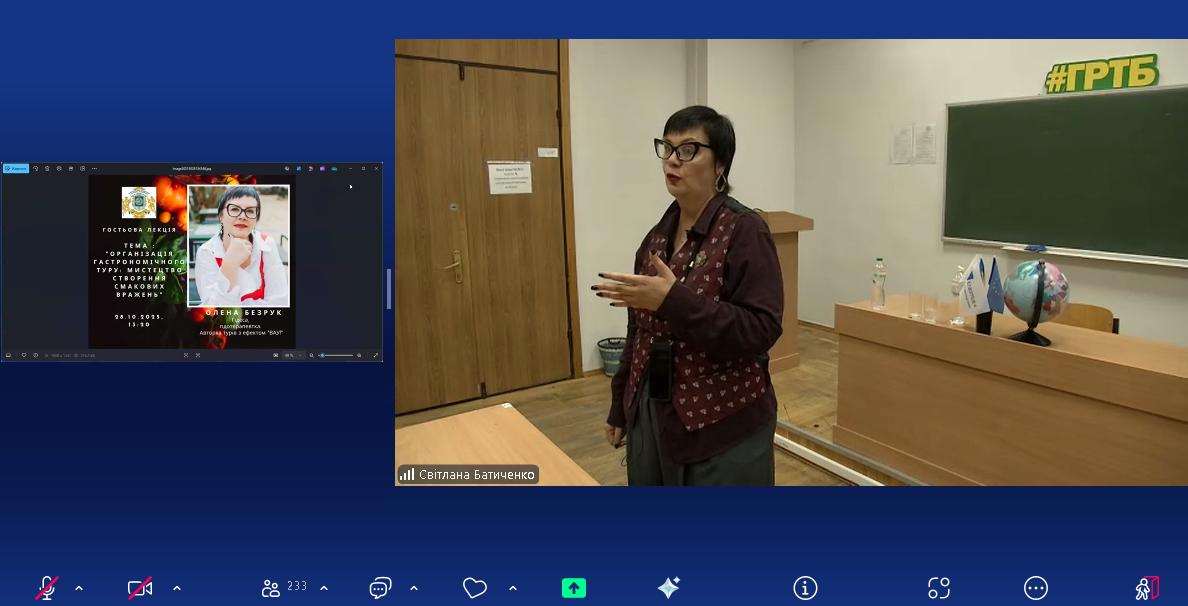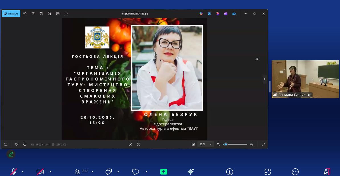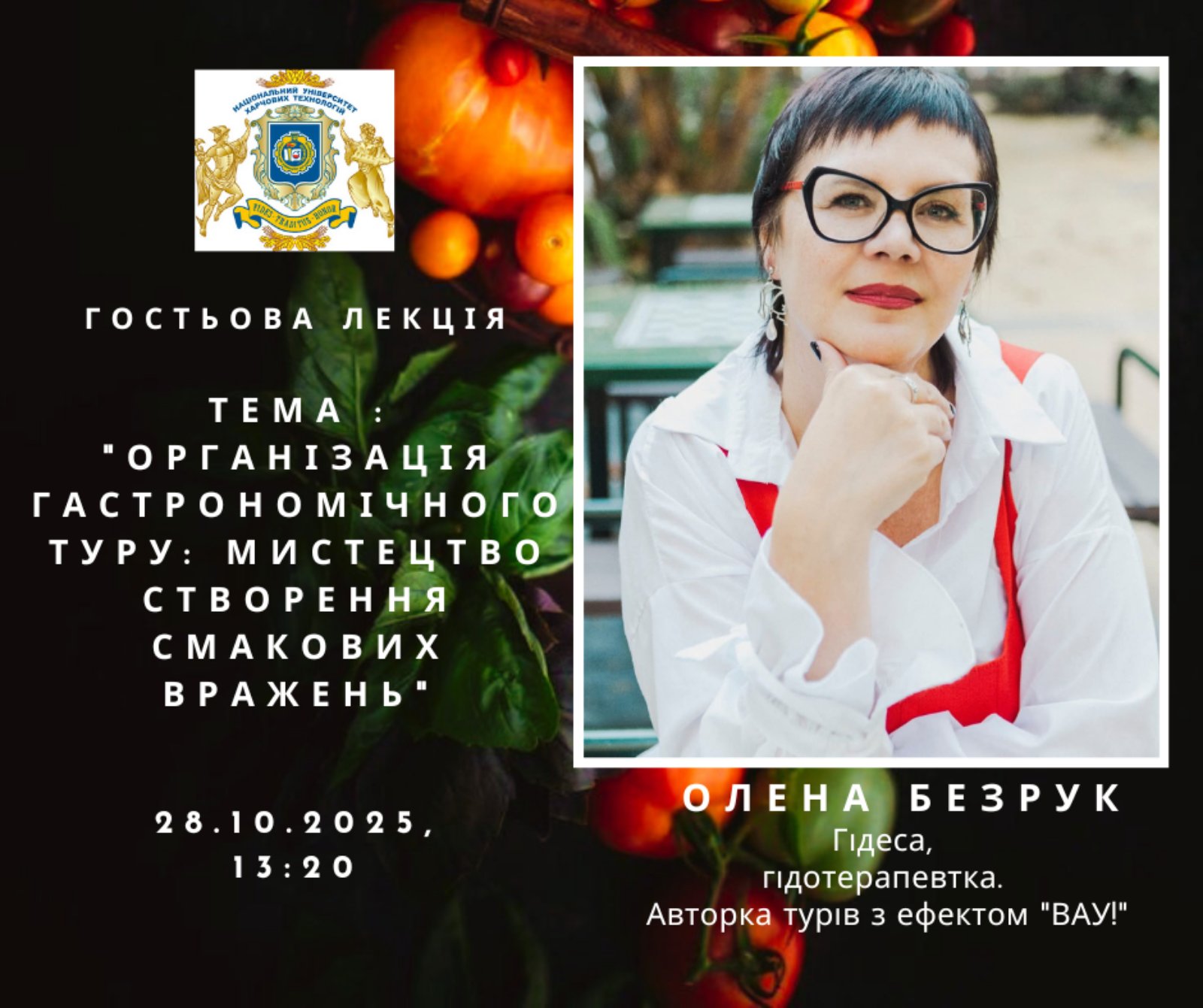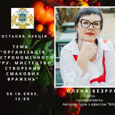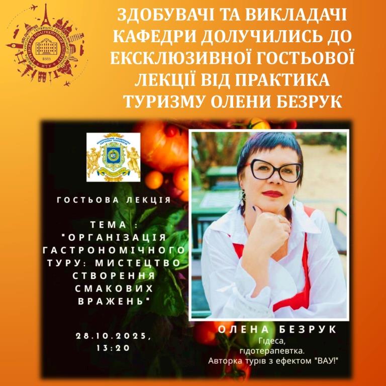 📅 28 жовтня 2025 року студенти та викладачі кафедри туризму і готельно-ресторанного бізнесу доєднались до ексклюзивної гостьової лекції «🍽️ Організація гастрономічного туру: мистецтво створення смакових вражень», яку проводила практик туризму Олена Безрук (Facebook https://www.facebook.com/share/17BYsrsebb/ ) — досвідчена гідеса, гідротерапевтка та визнана авторка турів з ефектом «ВАУ!» 💫