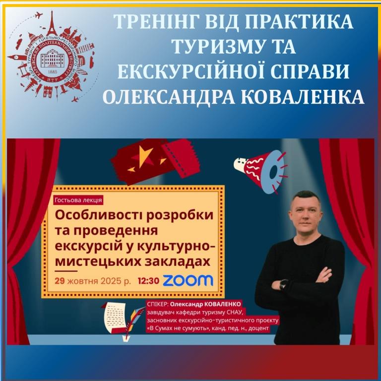 29 жовтня 2025 р. для здобувачів кафедри туризму і готельно-ресторанного бізнесу було проведено гостьовий онлайн-тренінг «Особливості розробки та проведення екскусрій у культурно-мистецьких закладах» від практика індустрії туризму та екскурсій Олександра КОВАЛЕНКА – завідувача кафедри туризму Сумського національного аграрного університету, голови правління ГО «Туристичний розвиток регіонів», гіда-екскурсовода Всеукраїнської асоціації гідів, керівника проекту «Туризм – професія та стиль життя», кандидата педагогічних наук, доцента, засновника відомого екскурсійно-туристичного проєкту «В Сумах не сумують».