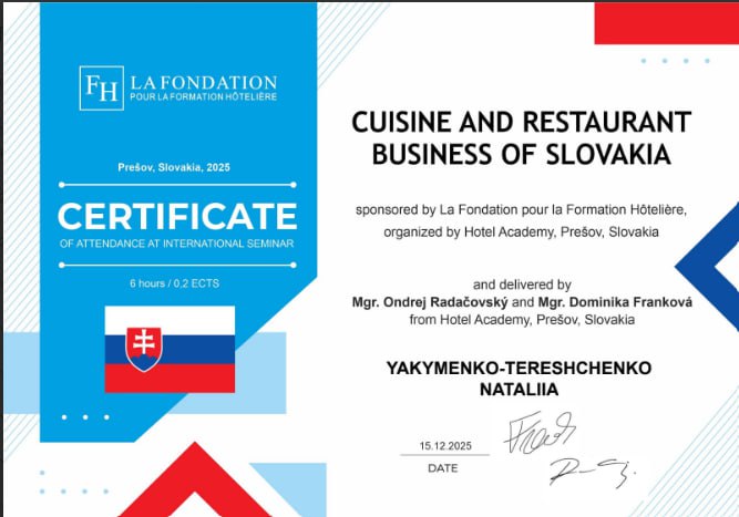 15 грудня 2025 року викладачі кафедри туризму і готельно-ресторанного бізнесу долучилися до міжнародного онлайн-вебінару «Cuisine and Restaurant Business of Slovakia», який відбувся за підтримки La Fondation pour la Formation Hôtelière (Швейцарія) та транслювався з Hotel Academy у місті Пряшів (Словаччина) 🌍🤝.