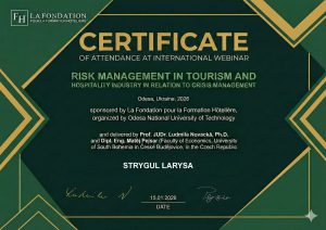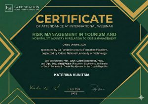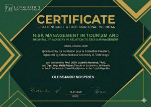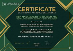 15 січня 2026 року викладачі та здобувачі кафедри туризму і готельно-ресторанного бізнесу долучилися до міжнародного вебінару «Risk Management in Tourism and Hospitality Industry in Relation to Crisis Management».