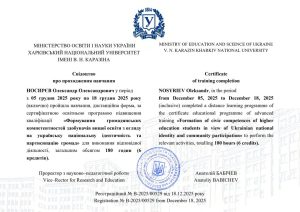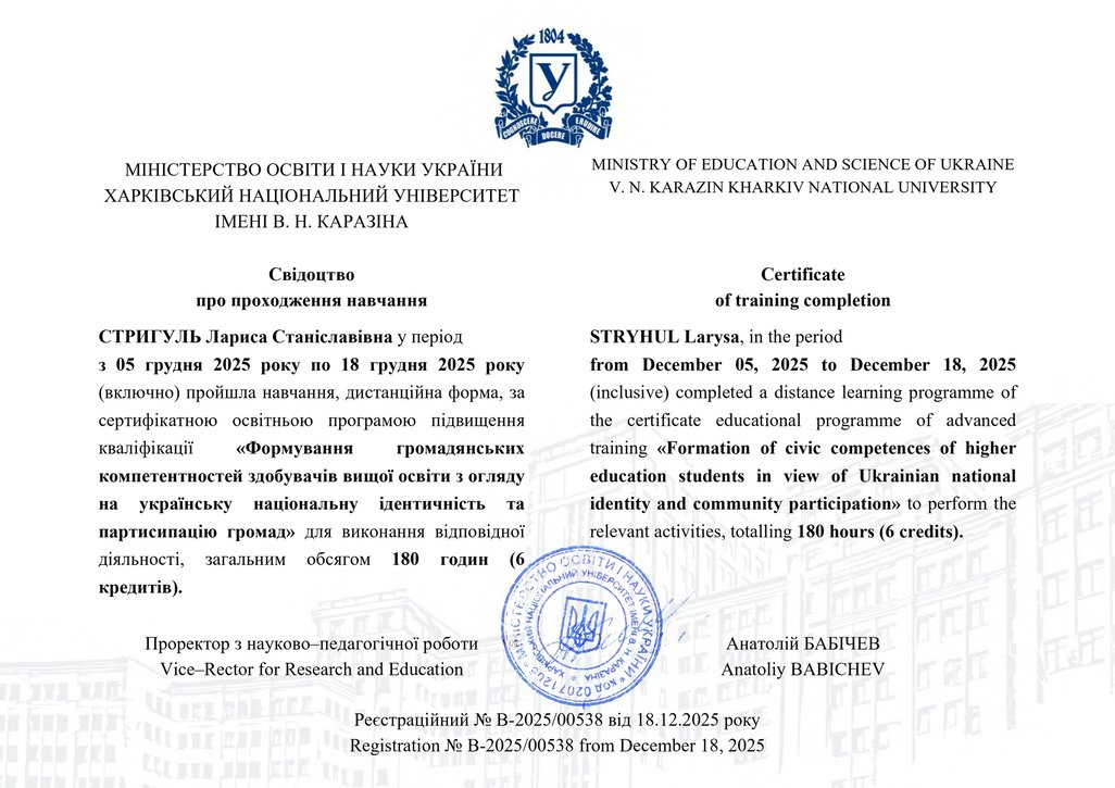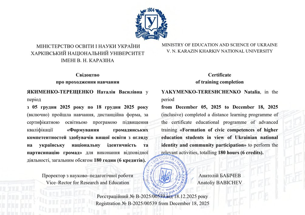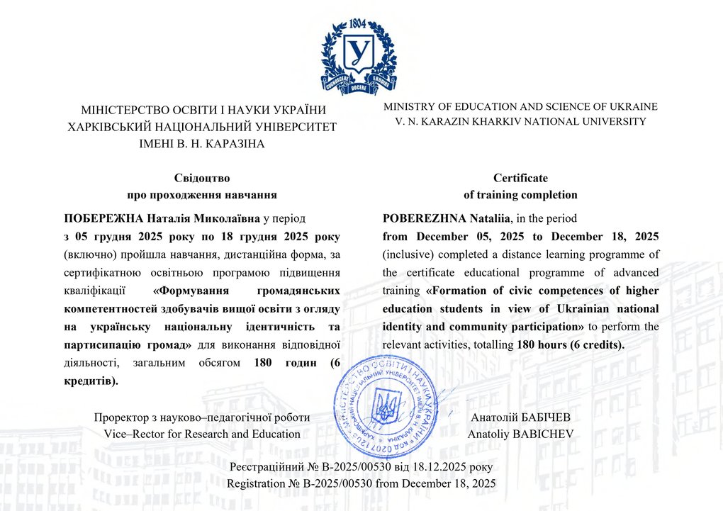Викладачі кафедри туризму і готельно-ресторанного бізнесу у період з 05 грудня 2025 року по 18 грудня 2025 року (включно) пройшли навчання у Харківському національному університеті імені В. Н. Каразіна 🏛️ за сертифікатною освітньою програмою підвищення кваліфікації «Формування громадянських компетентностей здобувачів вищої освіти з огляду на українську національну ідентичність та партисипацію громад» для виконання відповідної діяльності, загальним обсягом 180 годин (6 кредитів ЄКТС).