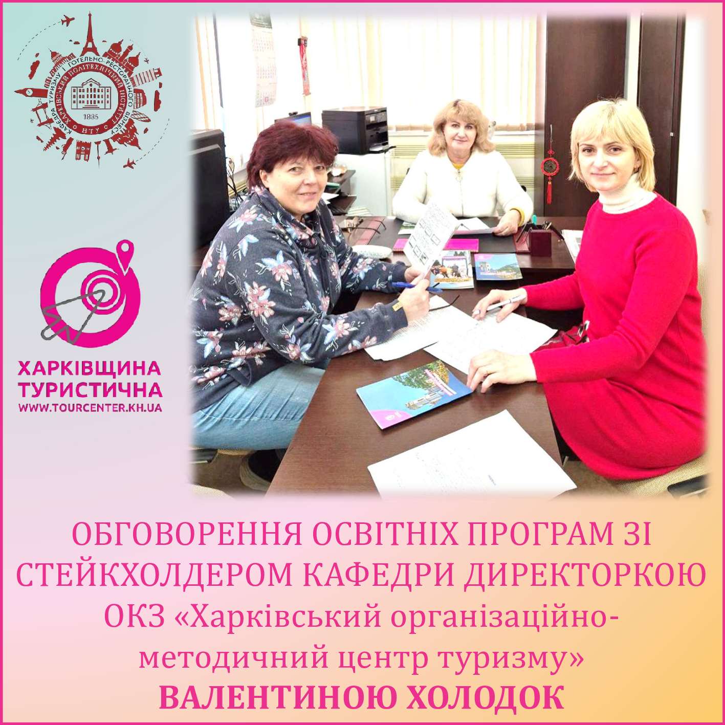 Валентина Дмитрівна ХОЛОДОК та колектив ОКЗ «Харківський організаційно-методичний центр туризму» є активними стейкхолдерами кафедри, постійно підтримують та долучаються до обговорення й удосконалення освітніх програм спеціальностей J2 «Готельно-ресторанна справа та кейтеринг» 🍽️🏨 та J3 «Туризм і рекреація» 🌍🧳.