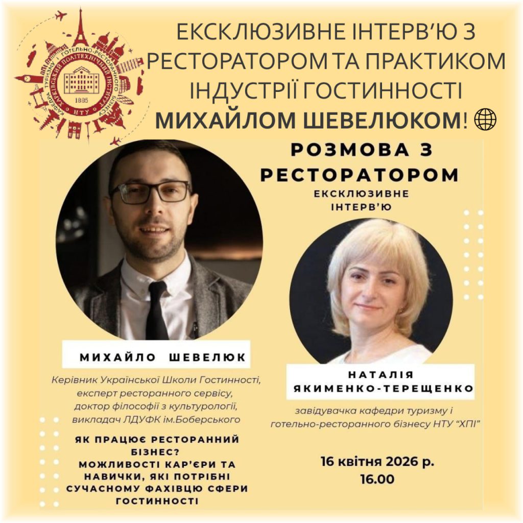 Кафедра туризму і готельно-ресторанного бізнесу НТУ «ХПІ» запрошує студентів, абітурієнтів та всіх, хто цікавиться сферою гостинності, на особливу подію — відкриту розмову з практиком ресторанного бізнесу.