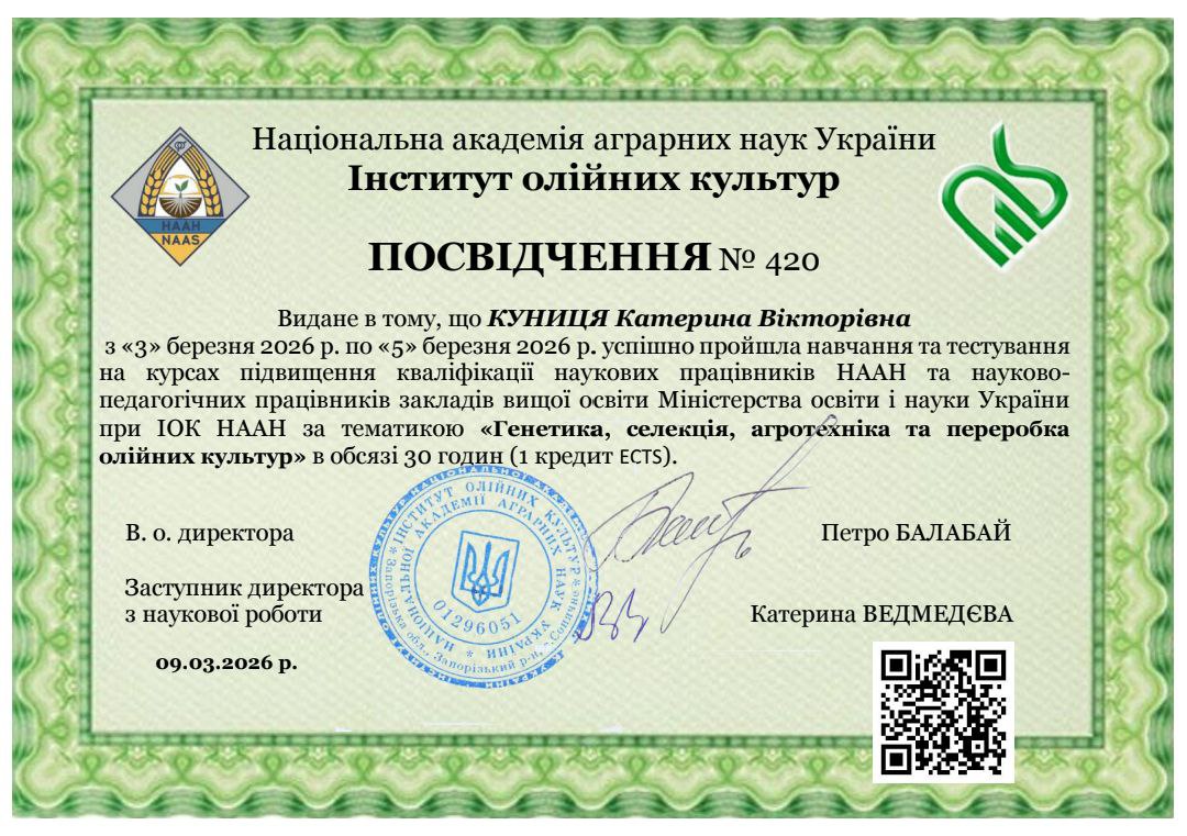 • успішне проходжнння навчання та тестування на курсах підвищення кваліфікації наукових працівників НААН та НПП ЗВО МОН України при ІОК НААН за тематикою «Генетика, селекція, агротехніка та переробка олійних культур», 03-05 березня 2026 р., 30 годин / 1 кредит ECTS (посвідчення № 420).