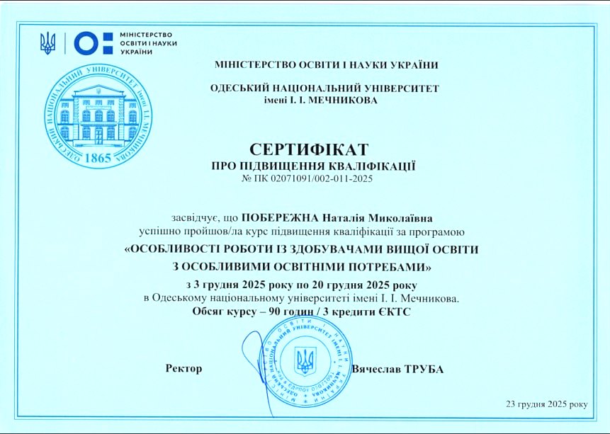 - успішне проходження курсу «Академічна доброчесність в університеті», ВУМ online, 09 грудня 2025 р. (сертифікат)
